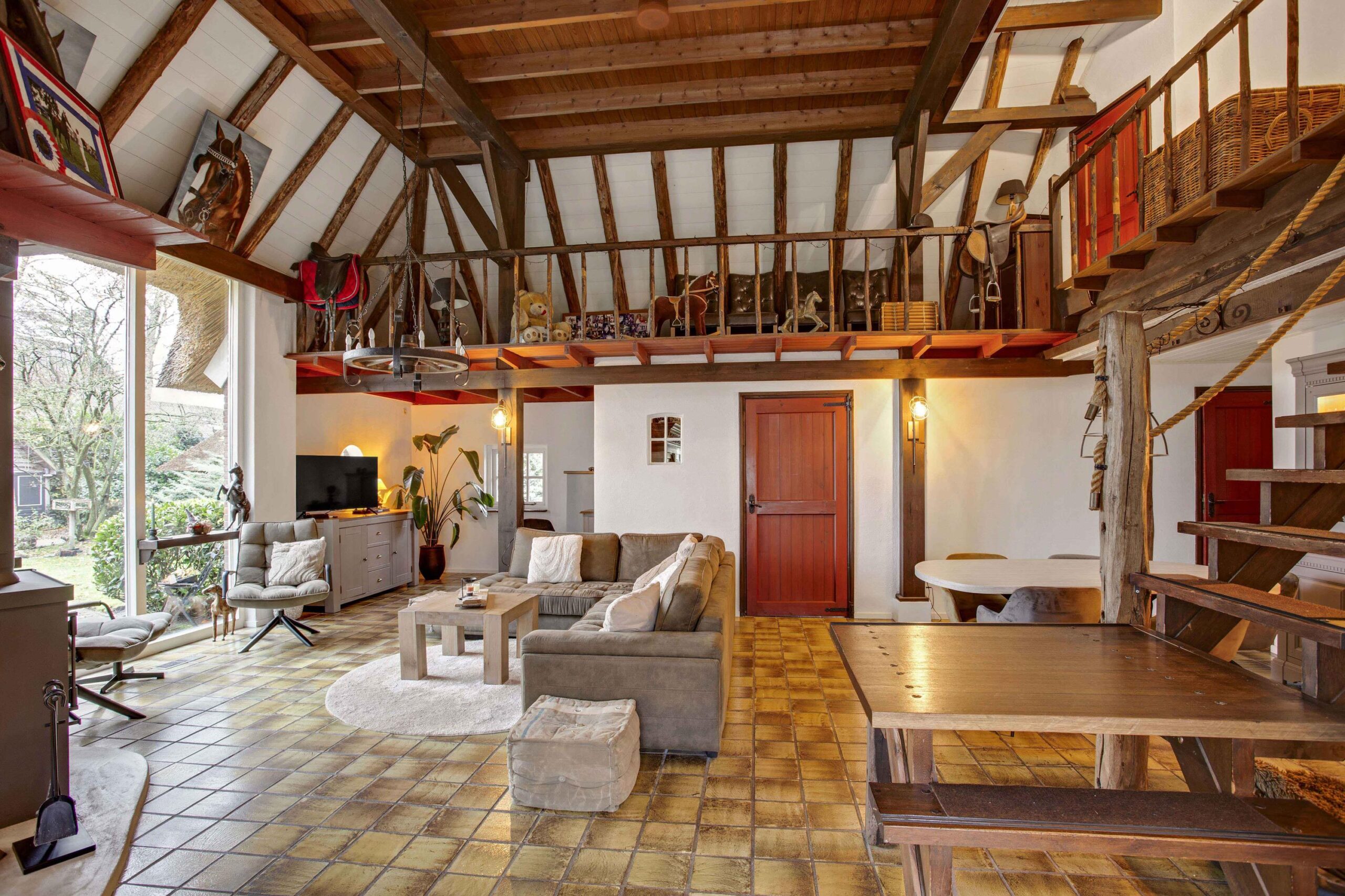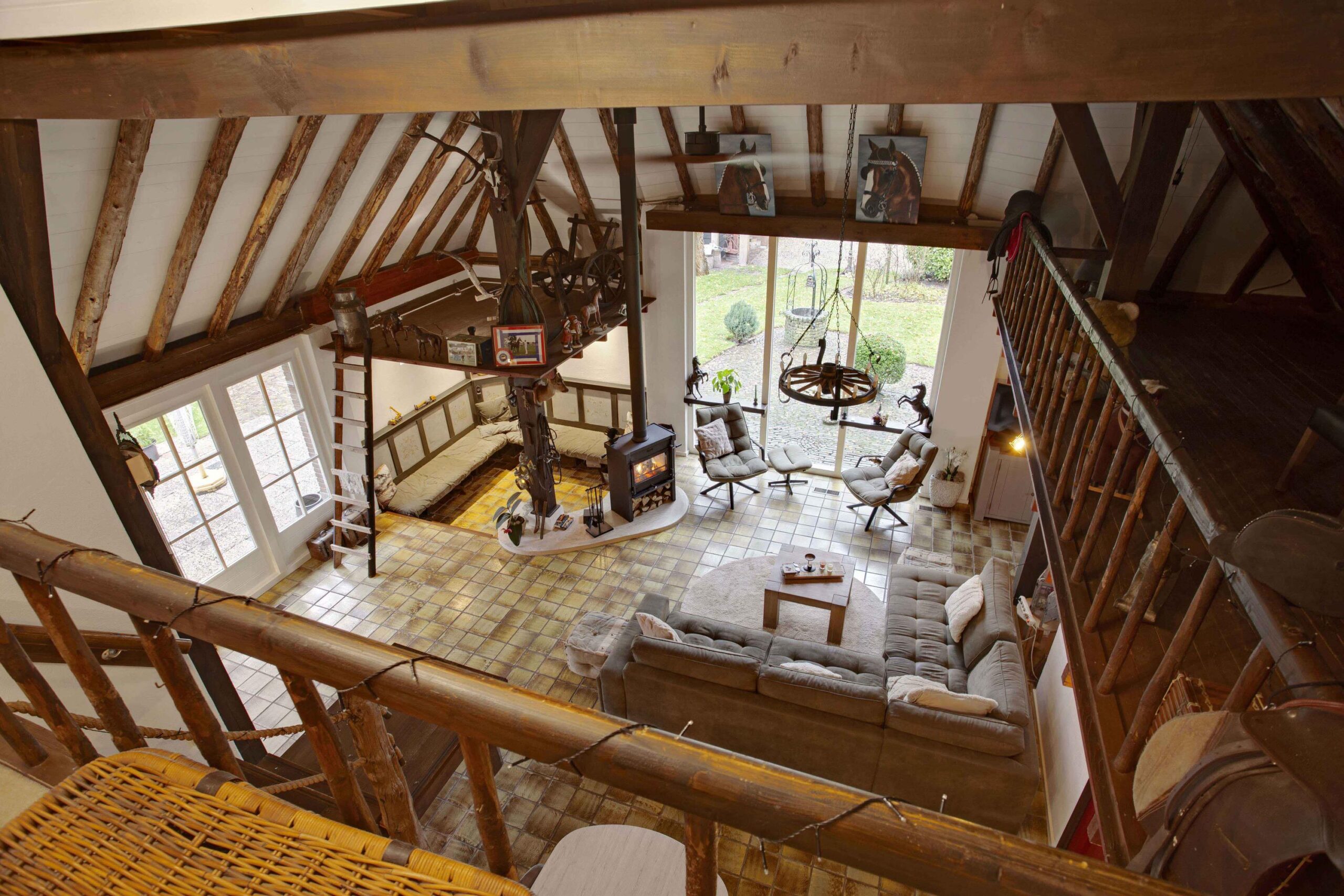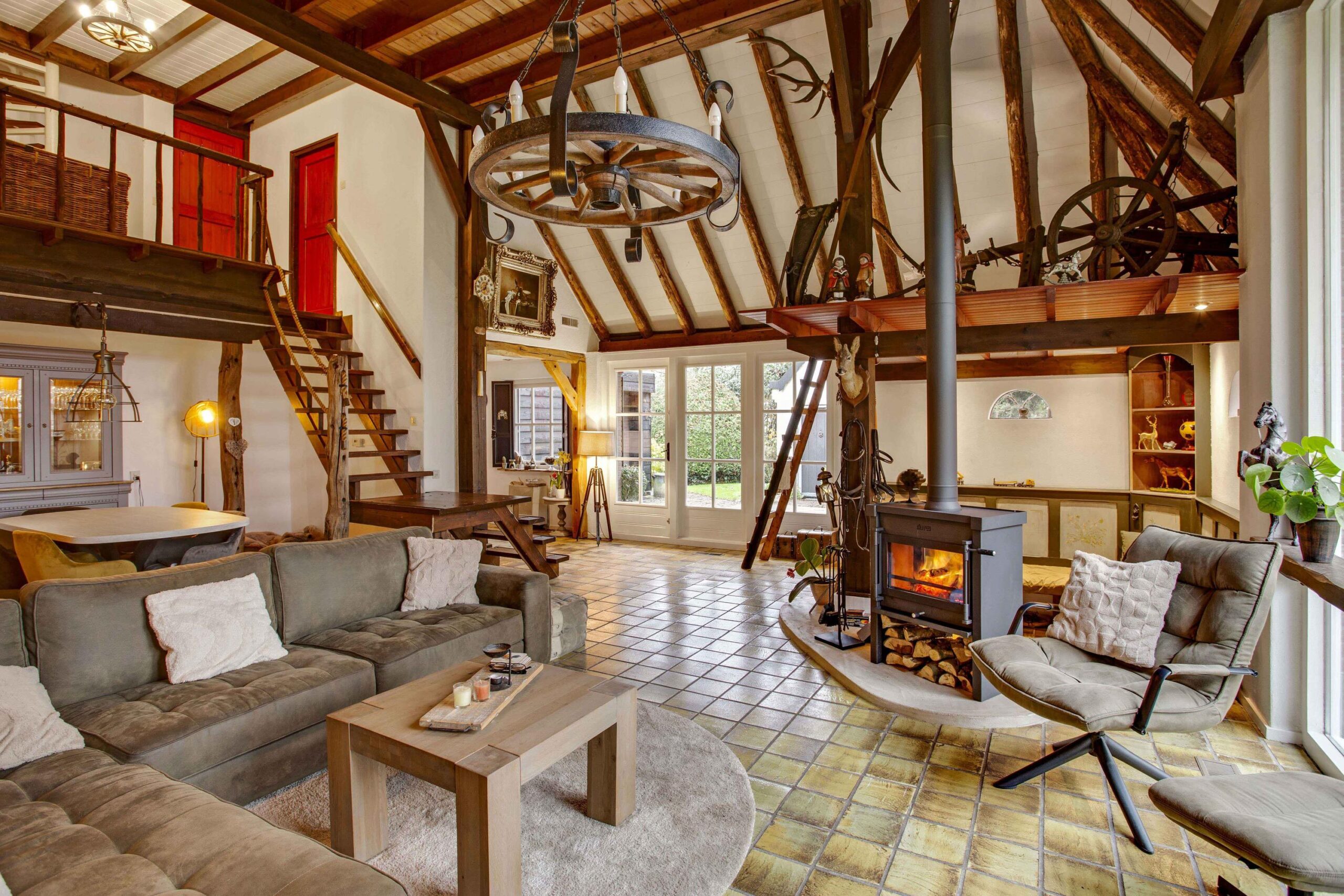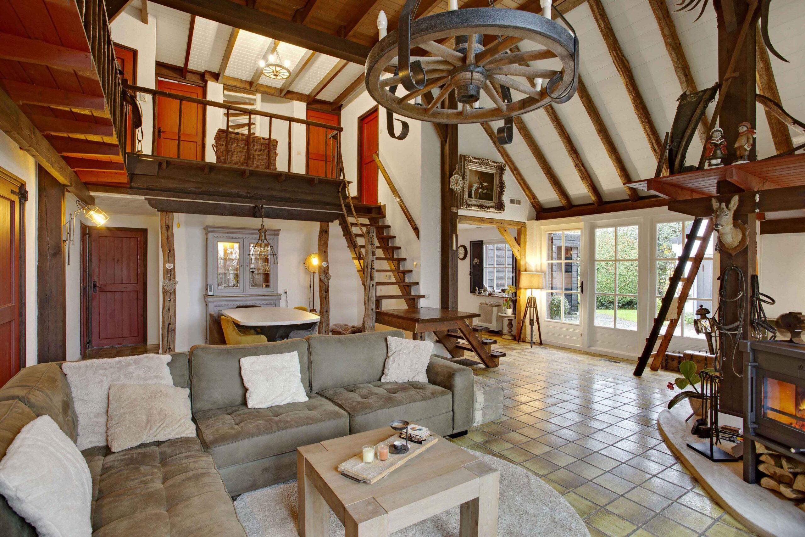 Zodra je het erf betreedt, proef je de sfeer van het verleden gecombineerd met de kwaliteit van nu. Door de wederopbouw in de jaren '70 is de woonboerderij naar een hedendaags niveau getild. Het resultaat is een woning waarbij de ziel van vroeger perfect samengaat met modern wooncomfort. Dankzij de goede isolatiekwaliteit biedt deze woonboerderij een verrassend hoge energieprestatie, iets wat zelden voorkomt bij dit type woningen. De voormalige stallen vormen het kloppende hart van het huis. Hier vind je een imposante woonkamer met vide, waar het hoge plafond, de houten gebinten en het spel van licht en ruimte samen een spectaculaire woonbeleving creëren. De zitkuil biedt in deze ruimte een intieme plek voor lange avonden bij de haard, terwijl de overige leefruimtes juist een open en luchtig gevoel geven. Overal zijn oude details zichtbaar die zorgen voor warmte, authenticiteit en charme. Een woonkamer zoals je deze werkelijk maar zelden tegenkomt.