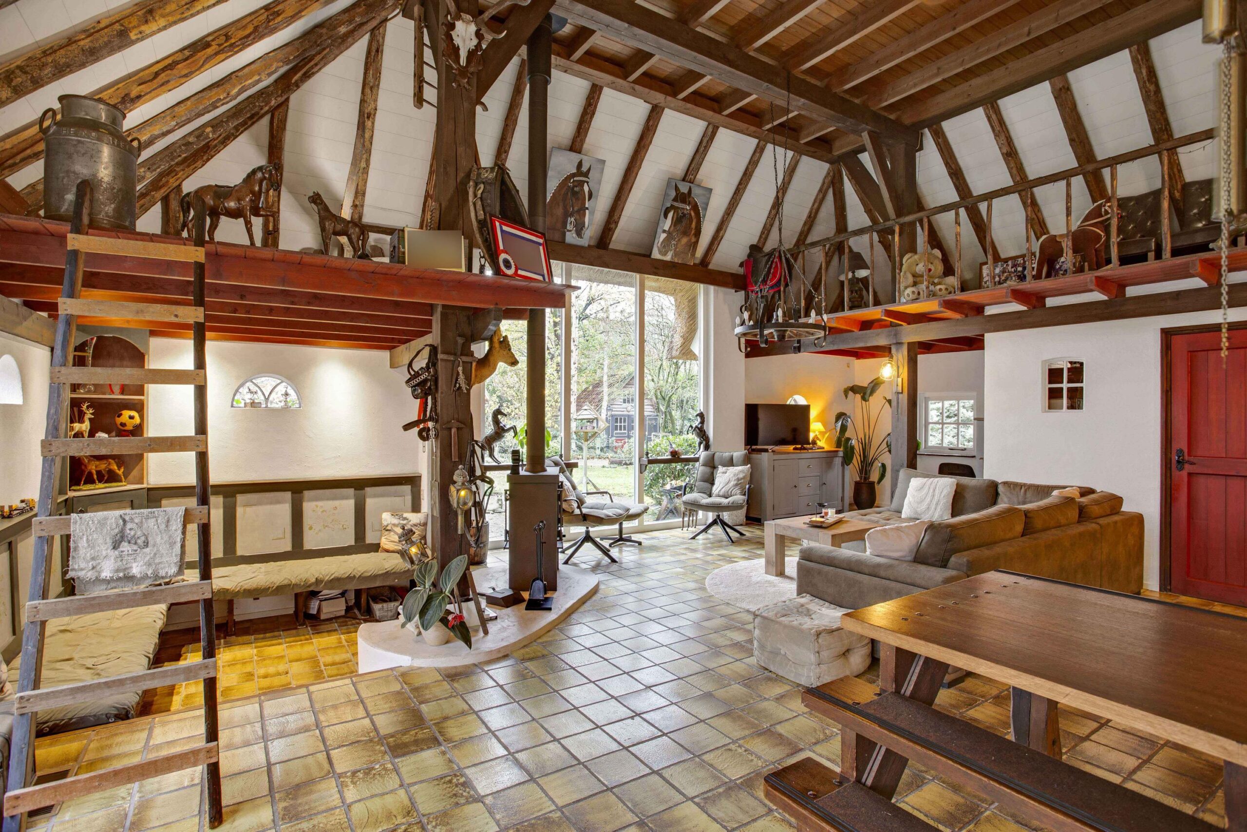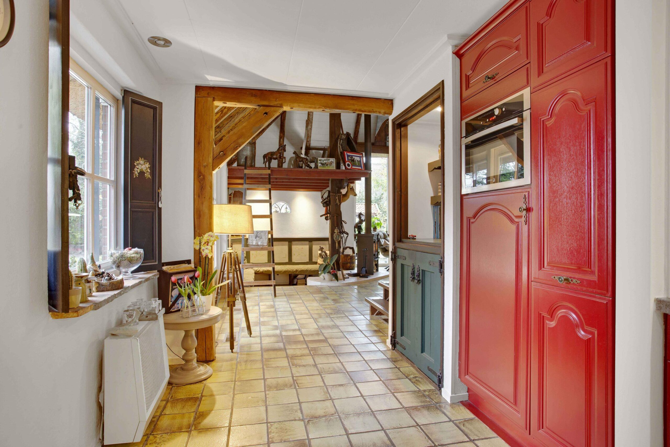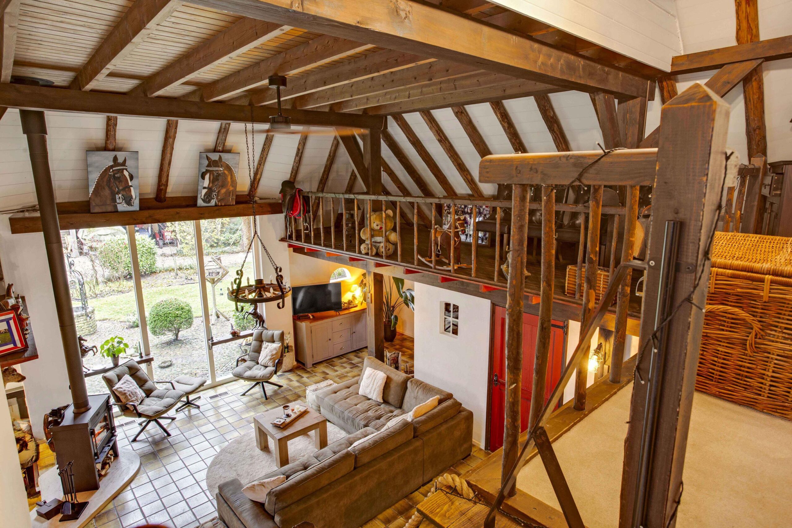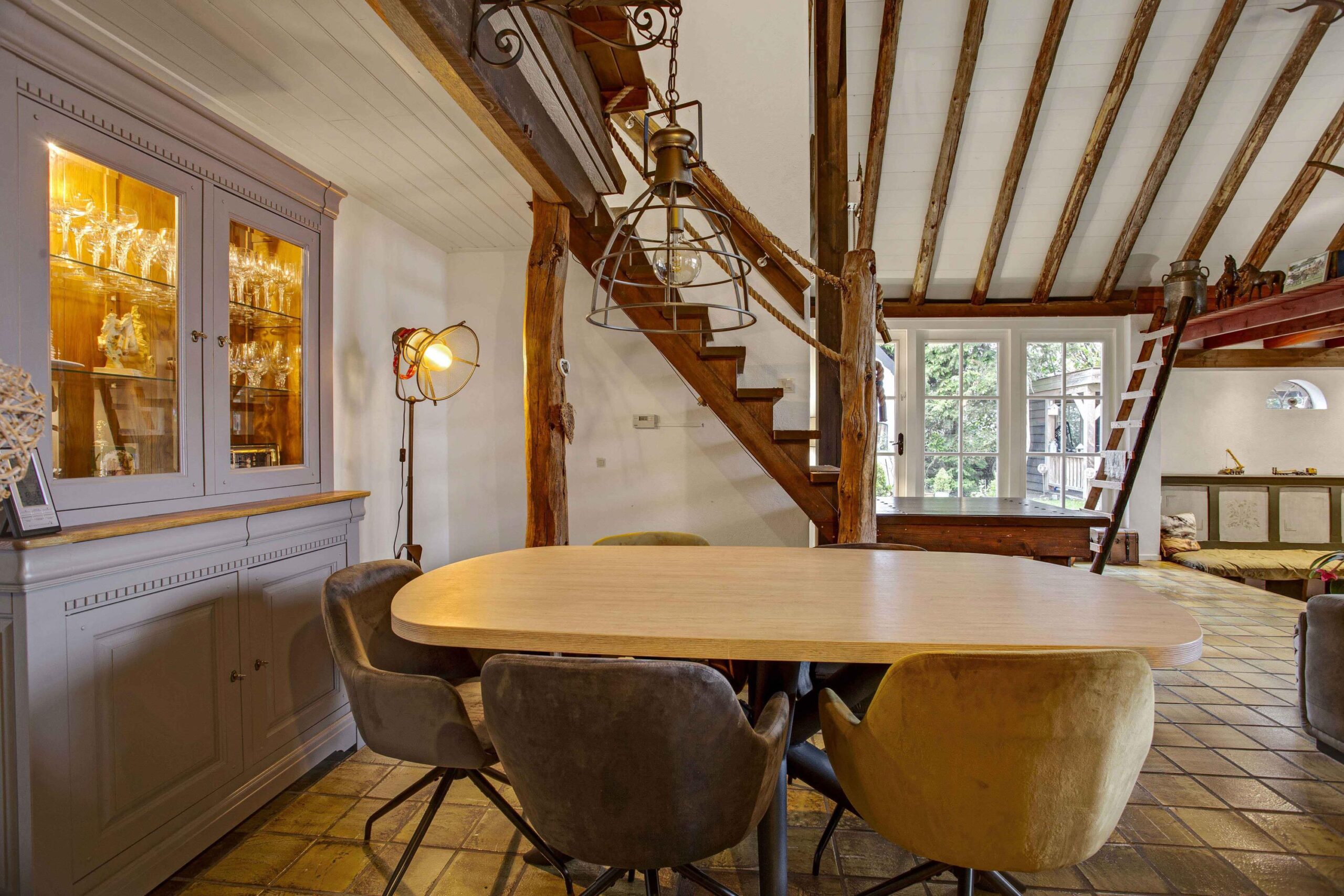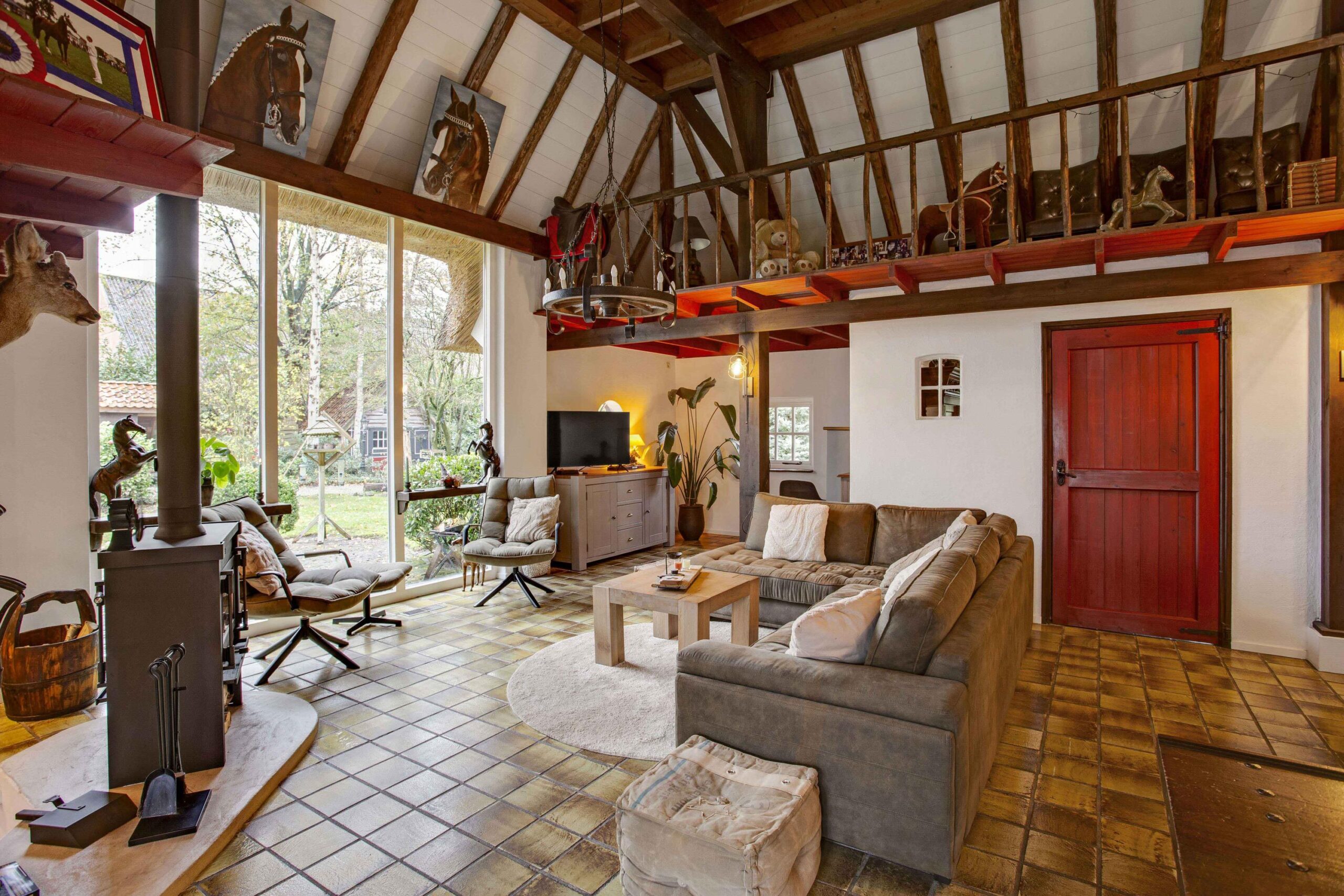 Zodra je het erf betreedt, proef je de sfeer van het verleden gecombineerd met de kwaliteit van nu. Door de wederopbouw in de jaren '70 is de woonboerderij naar een hedendaags niveau getild. Het resultaat is een woning waarbij de ziel van vroeger perfect samengaat met modern wooncomfort. Dankzij de goede isolatiekwaliteit biedt deze woonboerderij een verrassend hoge energieprestatie, iets wat zelden voorkomt bij dit type woningen. De voormalige stallen vormen het kloppende hart van het huis. Hier vind je een imposante woonkamer met vide, waar het hoge plafond, de houten gebinten en het spel van licht en ruimte samen een spectaculaire woonbeleving creëren. De zitkuil biedt in deze ruimte een intieme plek voor lange avonden bij de haard, terwijl de overige leefruimtes juist een open en luchtig gevoel geven. Overal zijn oude details zichtbaar die zorgen voor warmte, authenticiteit en charme. Een woonkamer zoals je deze werkelijk maar zelden tegenkomt.