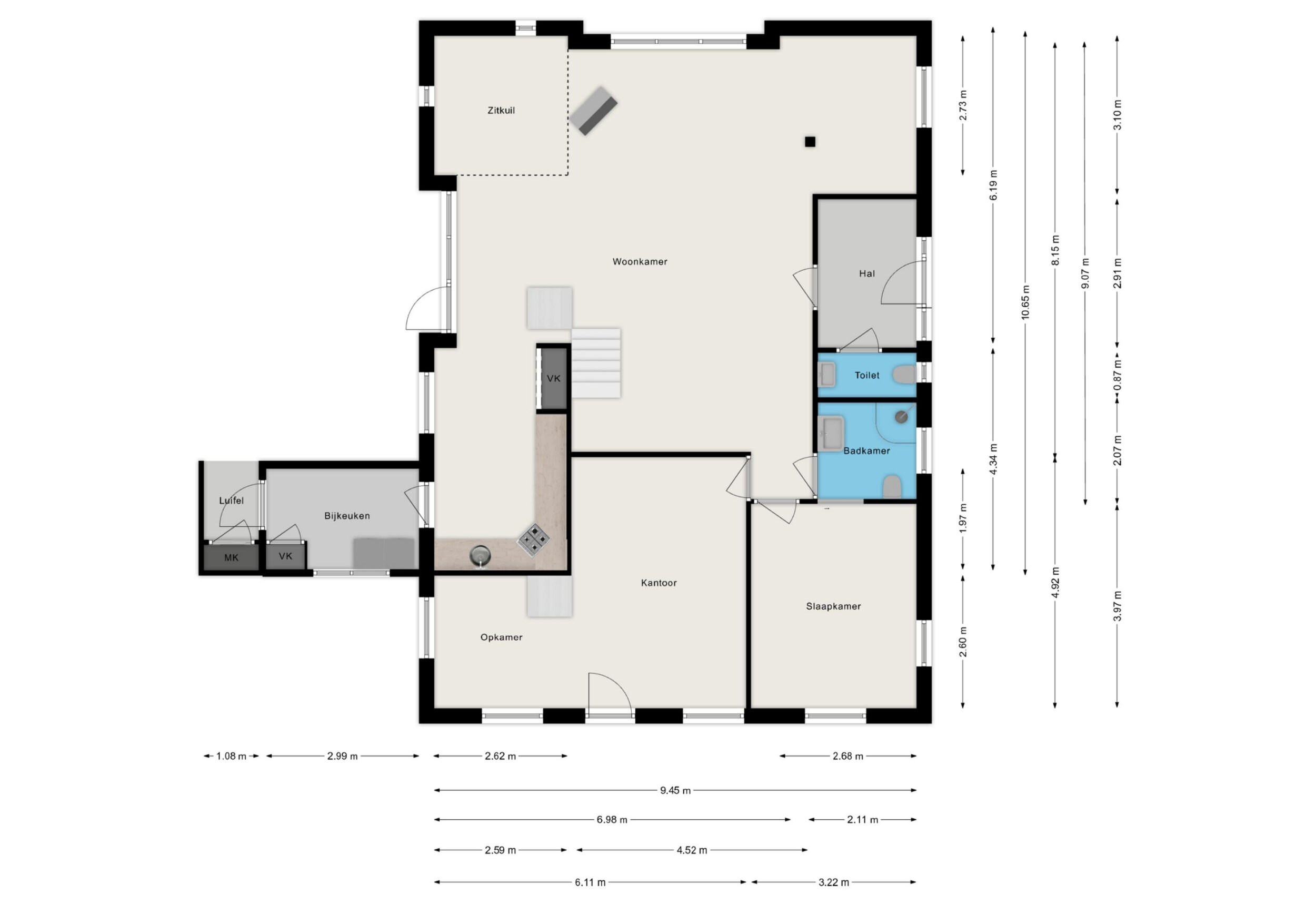 Entree, hal, garderobe, gemoderniseerde toiletruimte v.v. wandcloset en fonteintje, ruime en lichte living in de voormalige stallen / deel van de woning, omgebouwd tot sfeervolle en ruime woonkamer met prachtige oude details, een stijlvolle, vrijstaande houtkachel (blijft achter), meerdere zithoeken, videwerking tot in de nok, zitkuil en prachtig vrij uitzicht, aansluitend een open verbinding naar de keukenopstelling v.v. ossenrode keuken met diverse inbouwapparatuur, deur naar de bijkeuken met aansluitingen voor de wasapparatuur, deur naar buiten, luifel en meterkast. Vanuit de woonkamer is er toegang tot de ouderslaapkamer op de begane grond, een tweede slaapkamer / kantoorruimte met opkamer en toegang tot de kelder (gesitueerd onder de opkamer, afmetingen circa 2,80 x 3,25, hoogte circa 1,65 m.) en een compleet gemoderniseerde en luxe badkamer v.v. douchehoek met inbouw regendouche, wastafelmeubel en tweede toilet.
