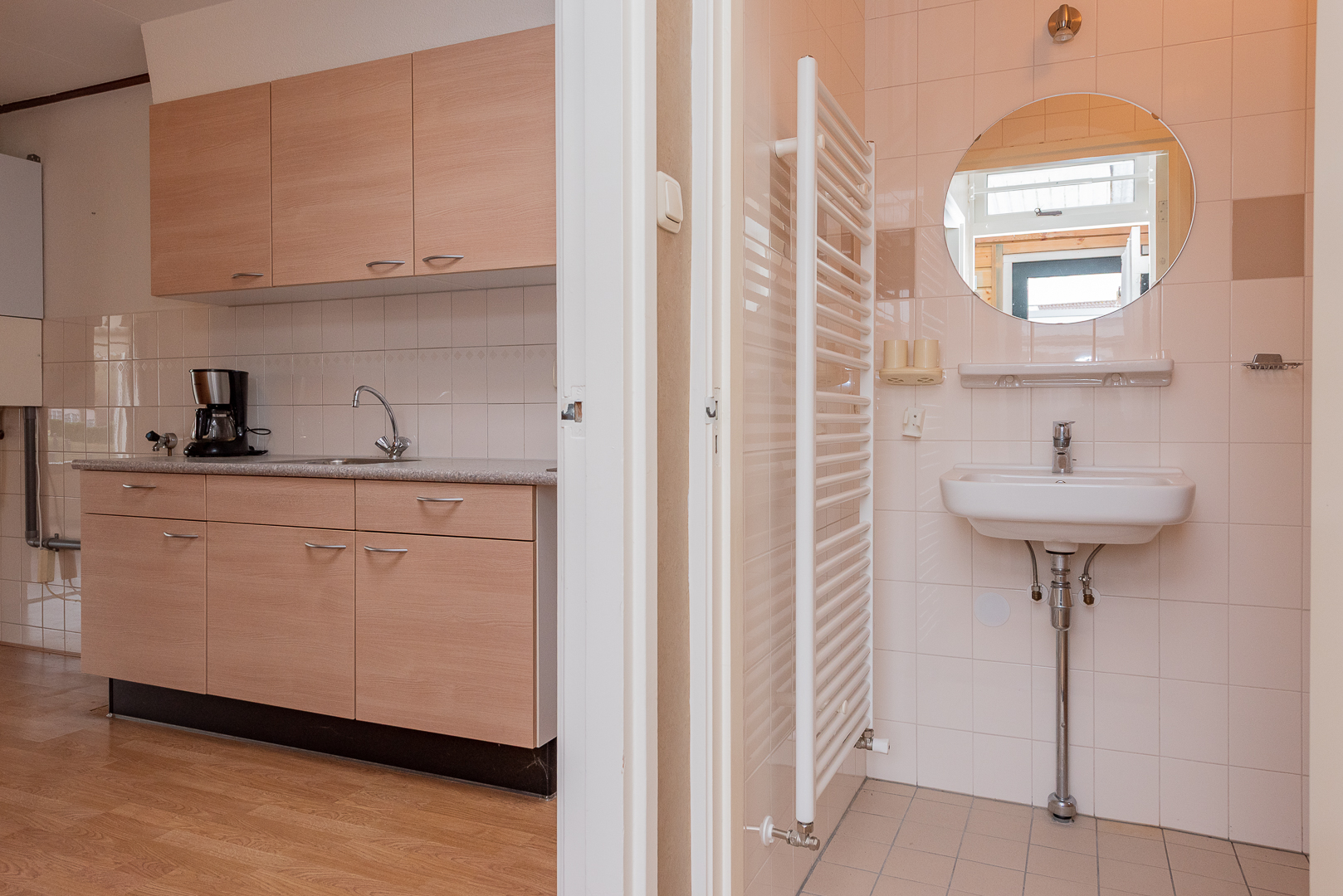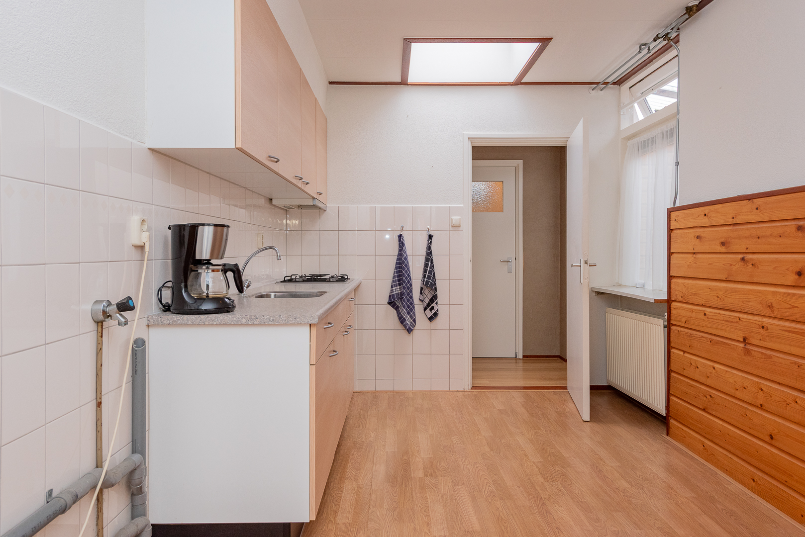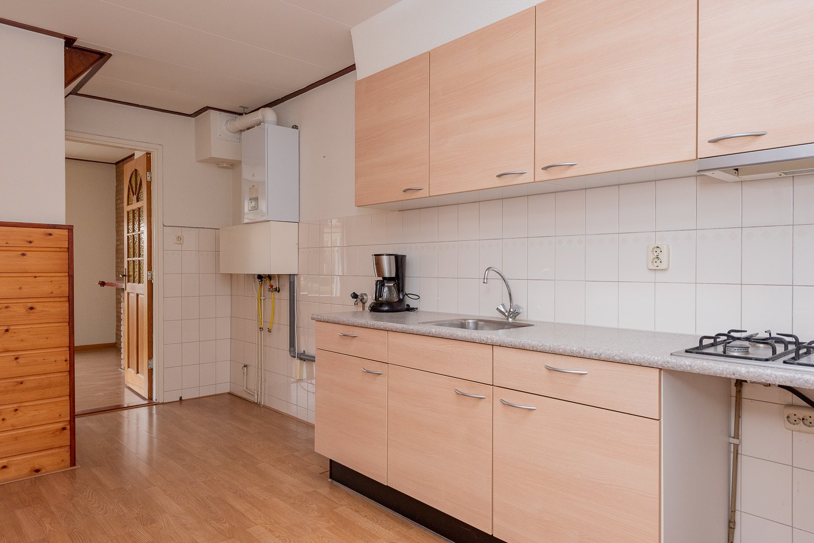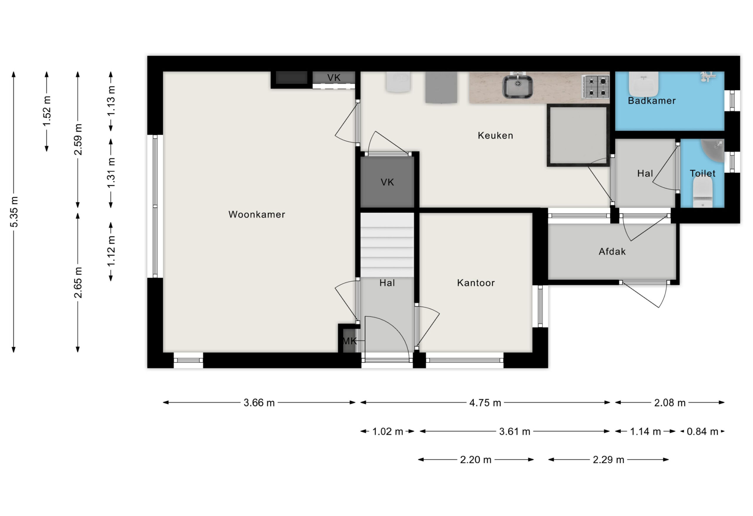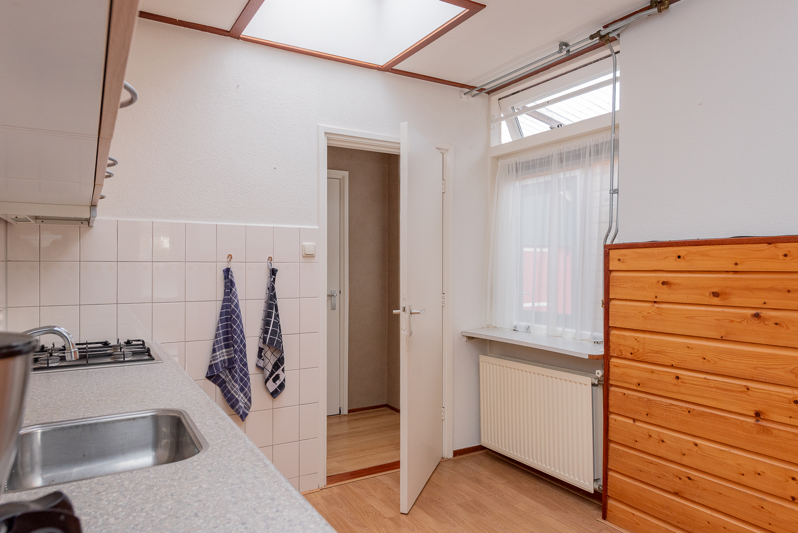 Entree, hal met trapopgang, meterkast, slaap-werkkamer aan de achterzijde van ca. 6 m², straatgerichte woonkamer van ca. 19.50 m² met gemetselde schouw, doorgang vanuit de woonkamer naar de keuken van ca. 11 m² v.v. eenvoudig keukenblok v.v. 4-pits gaskookplaat, afzuigkap en spoelbak, opstelplaats C.V.-ketel en aansluitingen voor de wasmachine, trapkast / kelderkast, portaal / verkeersruimte, nette licht betegelde badkamer v.v. douchehoek, designradiator en waskom, eveneens nette lichte betegelde toiletruimte v.v. staand closet en fonteintje, deur naar het afdak met deur naar buiten.