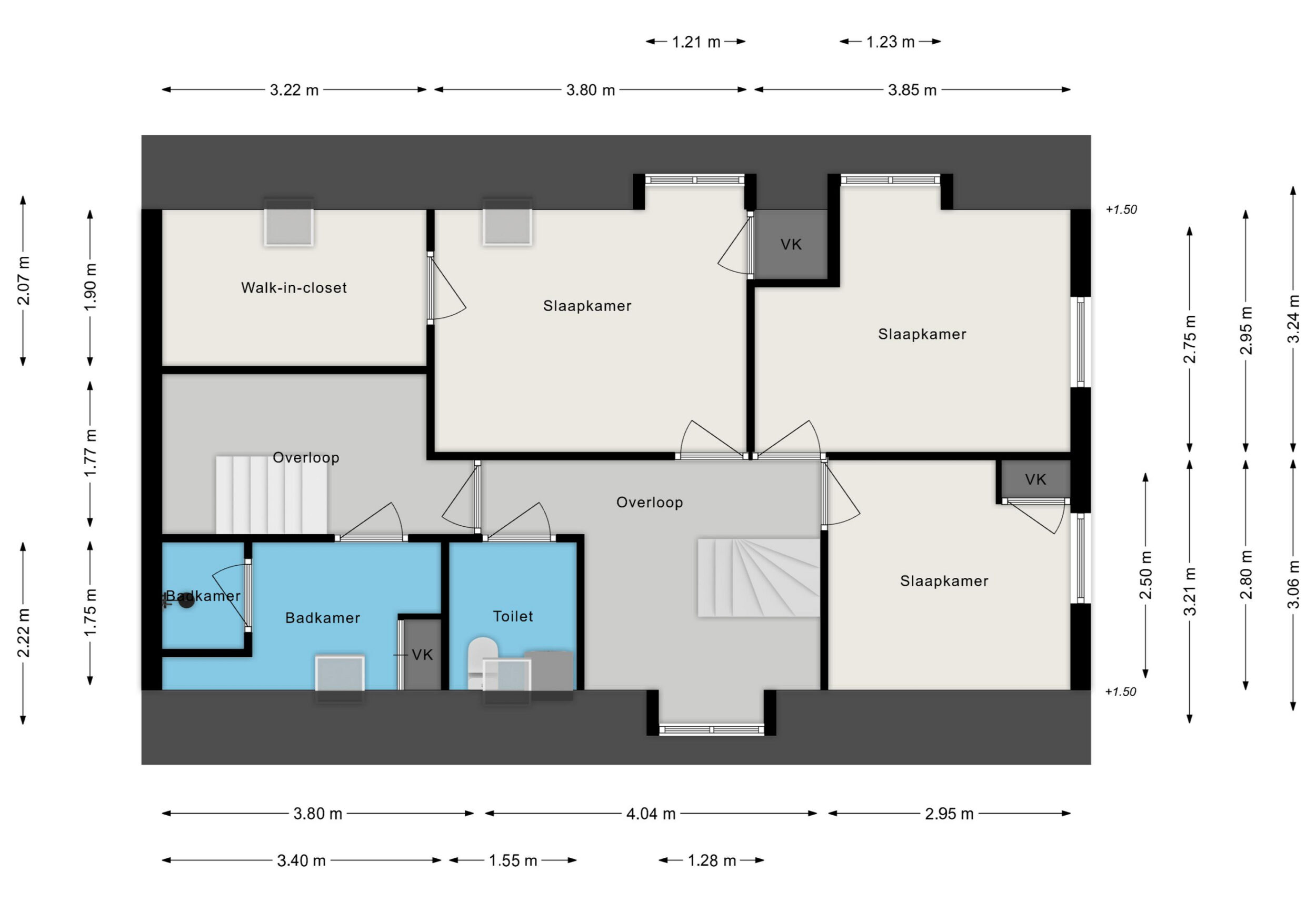 Overloop met dakkapel, ouderslaapkamer van ca. 11 m² v.v. dakkapel, vaste kast en toegang tot de walk-in-closet, tweede (kinder)slaapkamer van ca. 12 m² v.v. dakkapel, derde (kinder)slaapkamer van ca. 8.50 m² v.v. vaste inbouwkast, toiletruimte v.v. toilet, Velux tuimeldakraam en met aansluitingen van de wasmachine, tweede overloop, badkamer v.v. douchehoek en vaste kast met opstelplaats C.V.-combiketel.