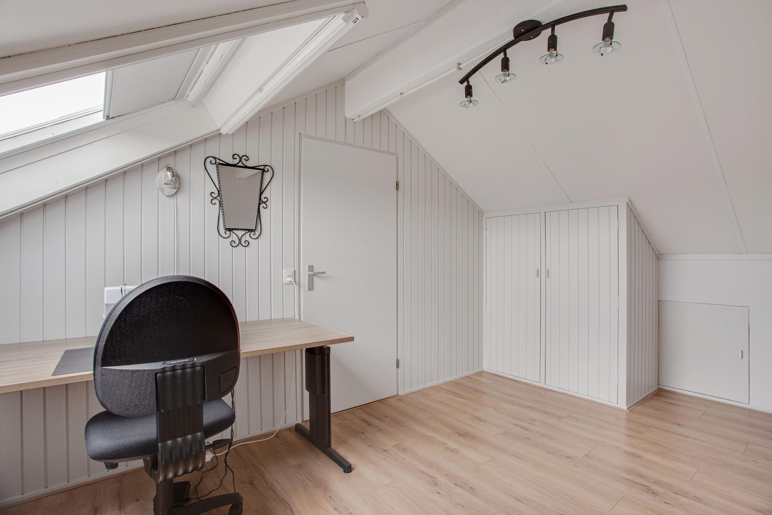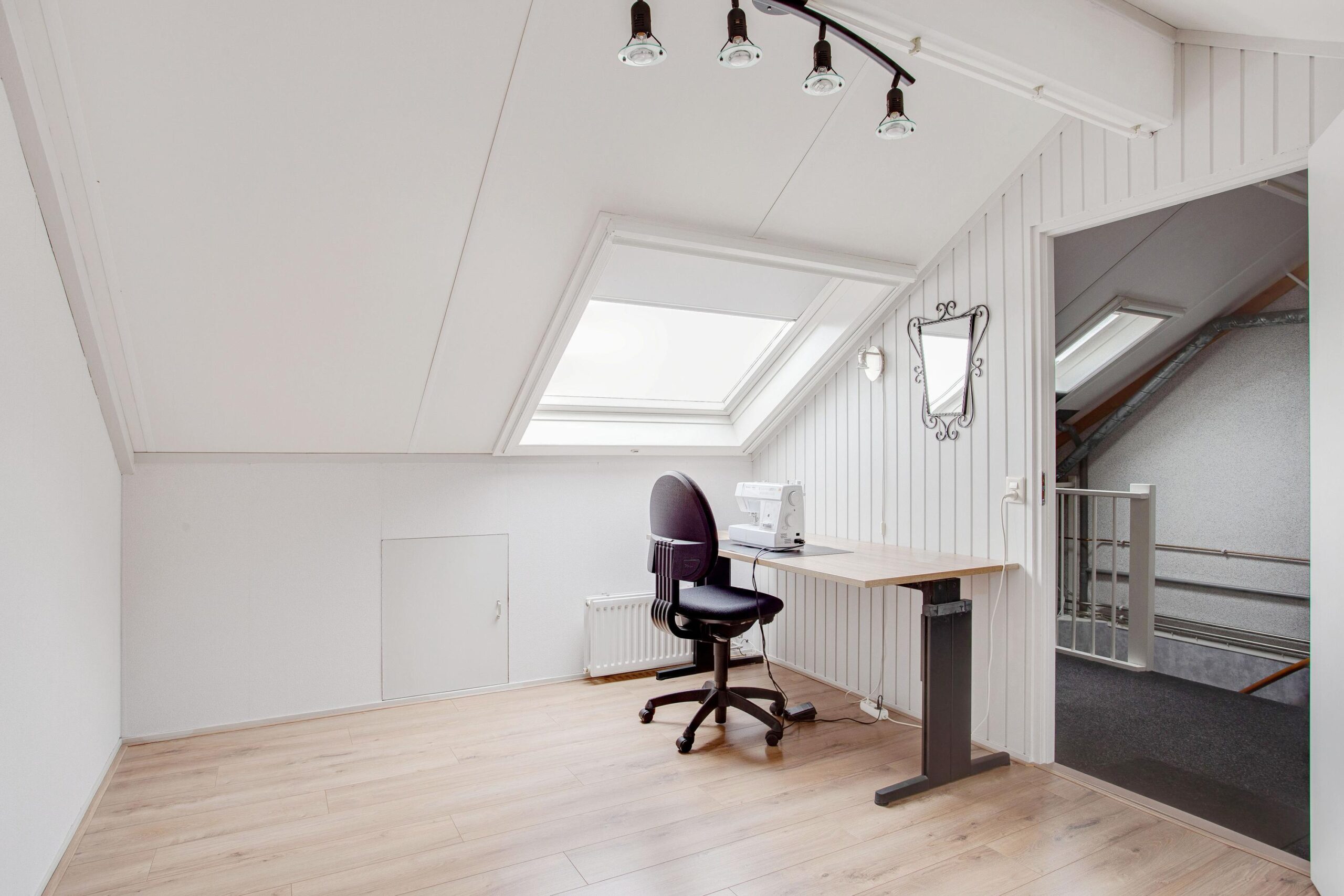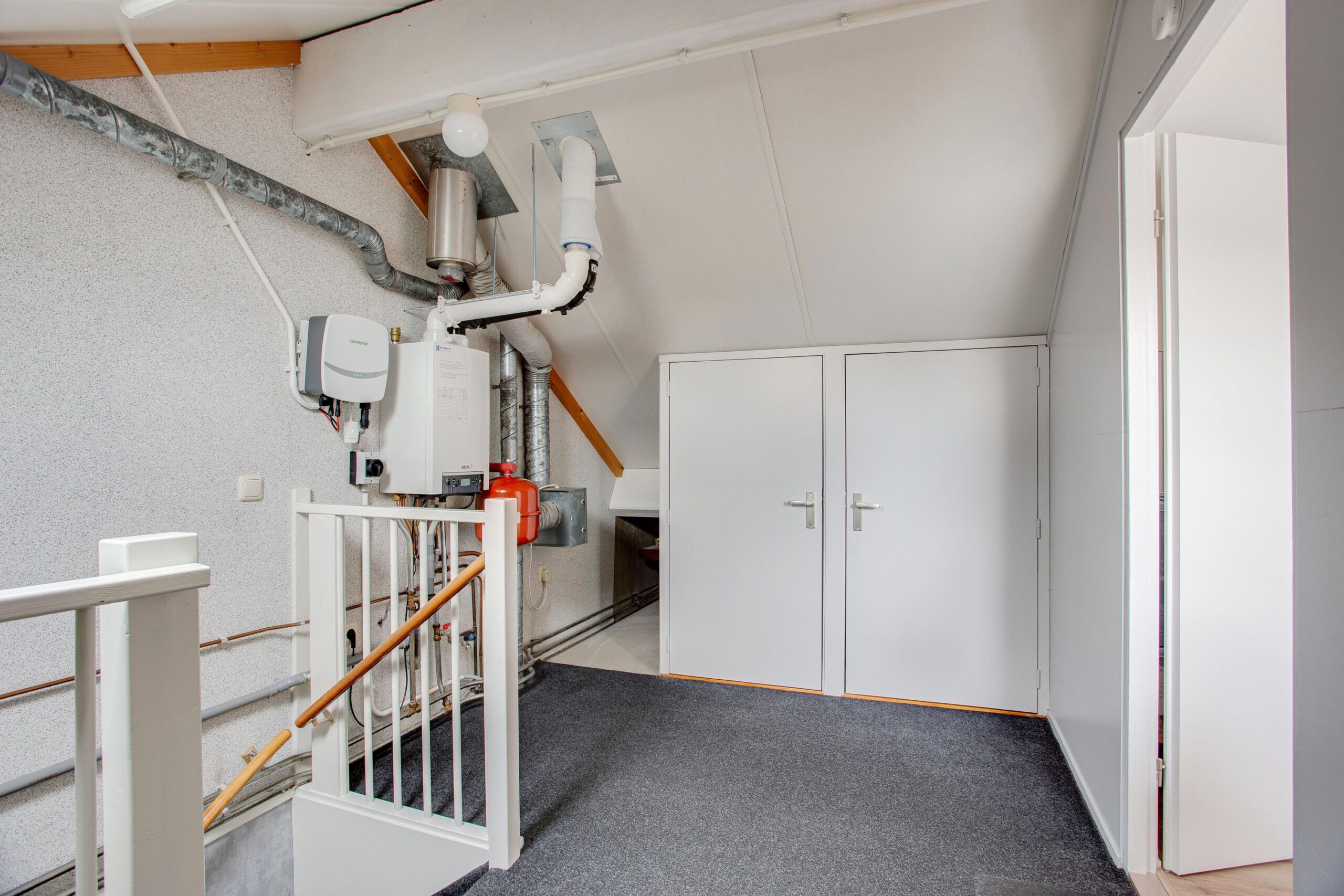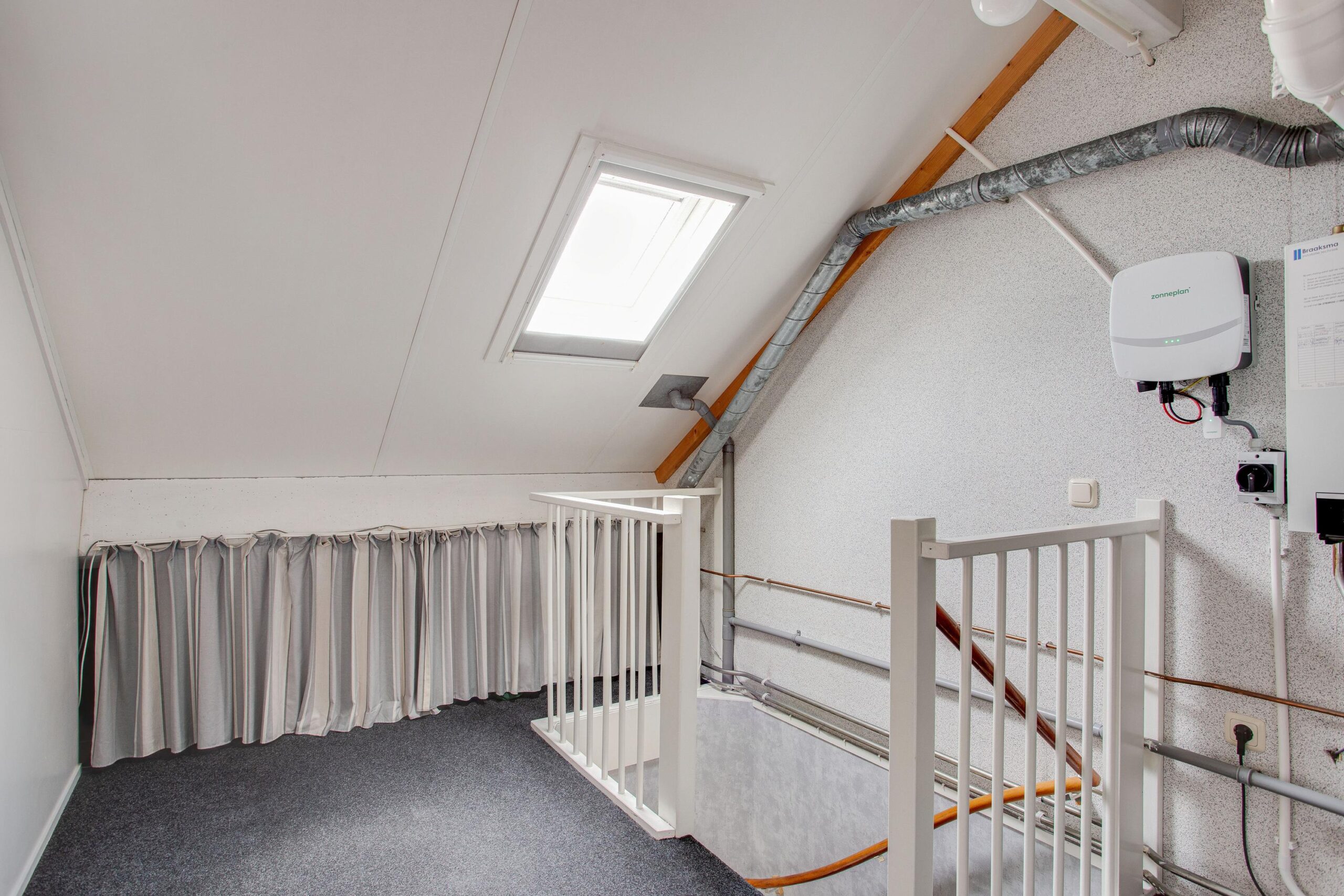 Via vaste trap bereikbare voorzolder met Velux tuimeldakraam, praktische bergkast onder het schuine gedeelte, opstelplaats C.V.-combiketel (Nefit) en M.V.-box, vierde ruime zolderkamer van ca. 9.50 m² v.v. praktische bergkast onder het schuine gedeelte en Velux tuimeldakraam.
