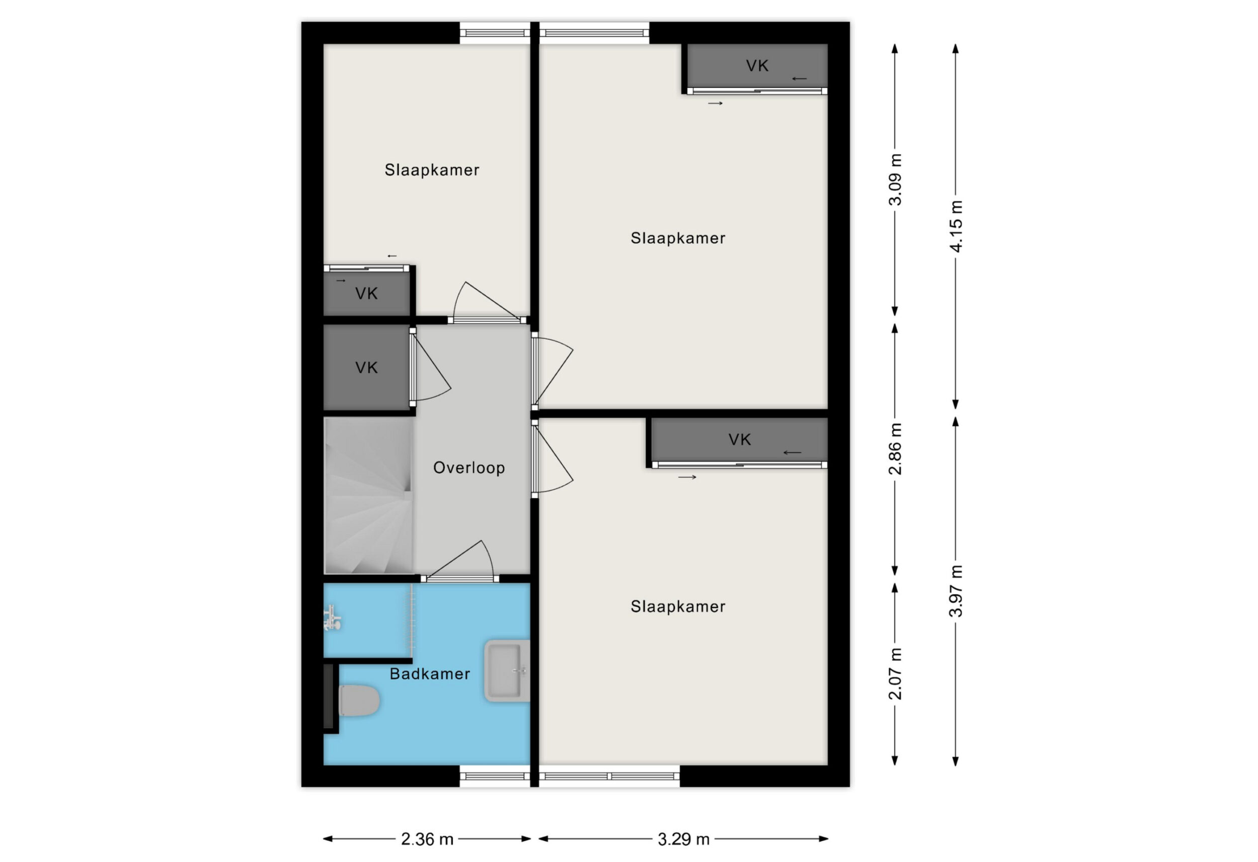 Overloop met vaste bergkast, verrassend ruime kinderslaapkamer aan de achterzijde van ca. 7 m², royale ouderslaapkamer eveneens aan de achterzijde van ca. 13.50 m², derde eveneens ruime slaapkamer aan de voorzijde van ca. 13 m². Alle slaapkamers zijn v.v. een praktische schuifkastenwand voor het opbergen van o.a. kleding. Licht betegelde badkamer v.v. douchehoek, wandcloset en wastafelmeubel.