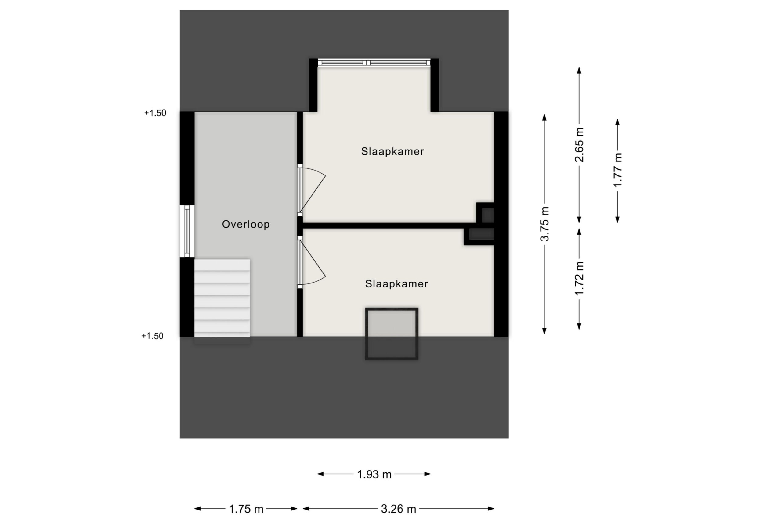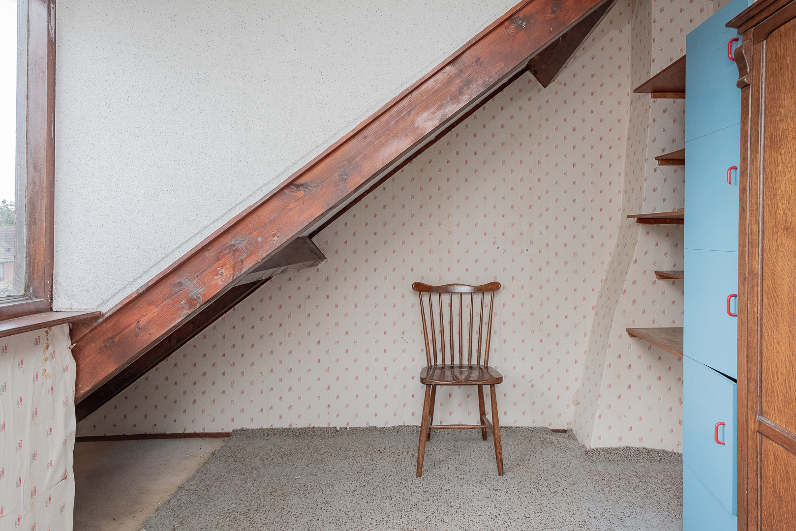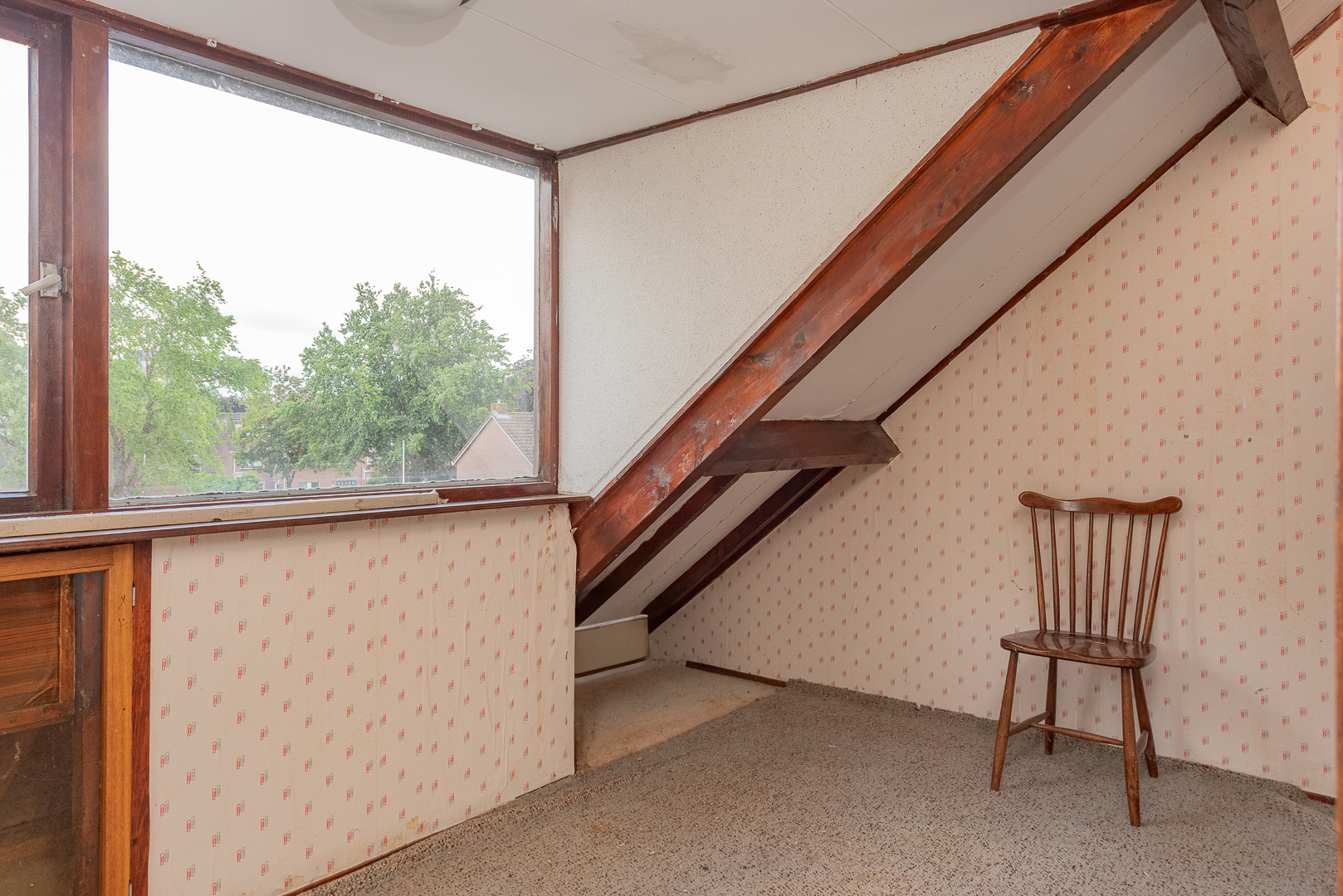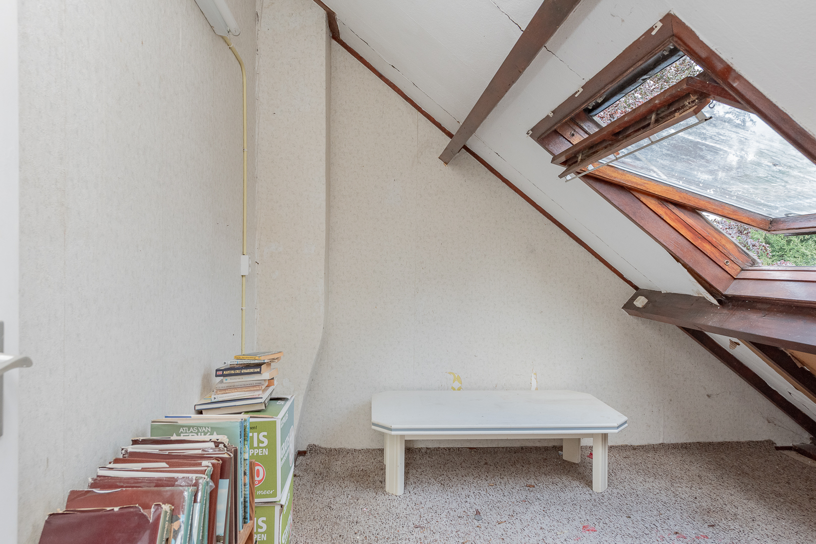 Via vaste trap bereikbare zolderverdieping, voorzolder, twee ruime zolderkamers waarvan één met dakkapel, slaapkamers van ca. 5.50 m2 en 7.50 m2, bergruimte achter de knieschotten