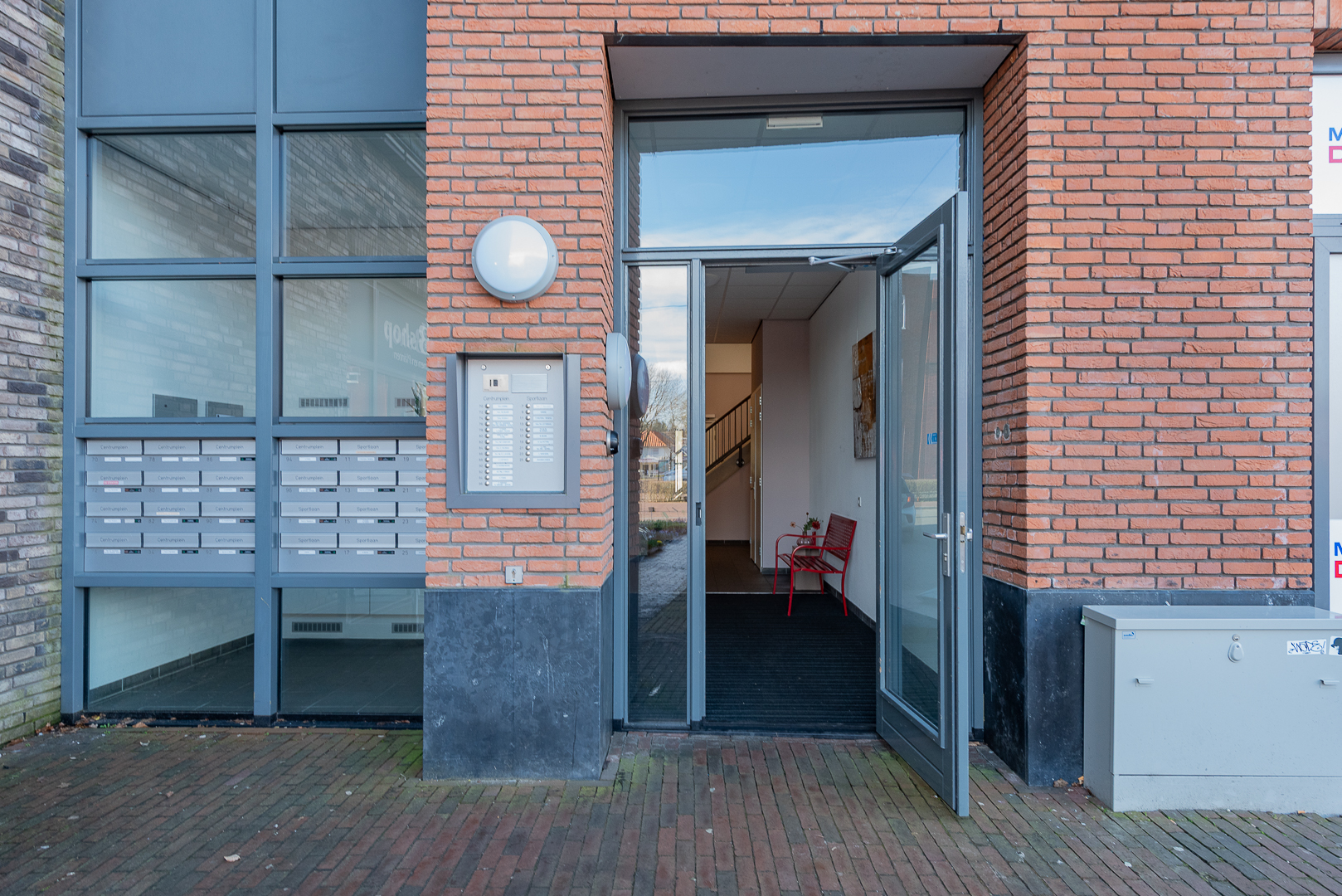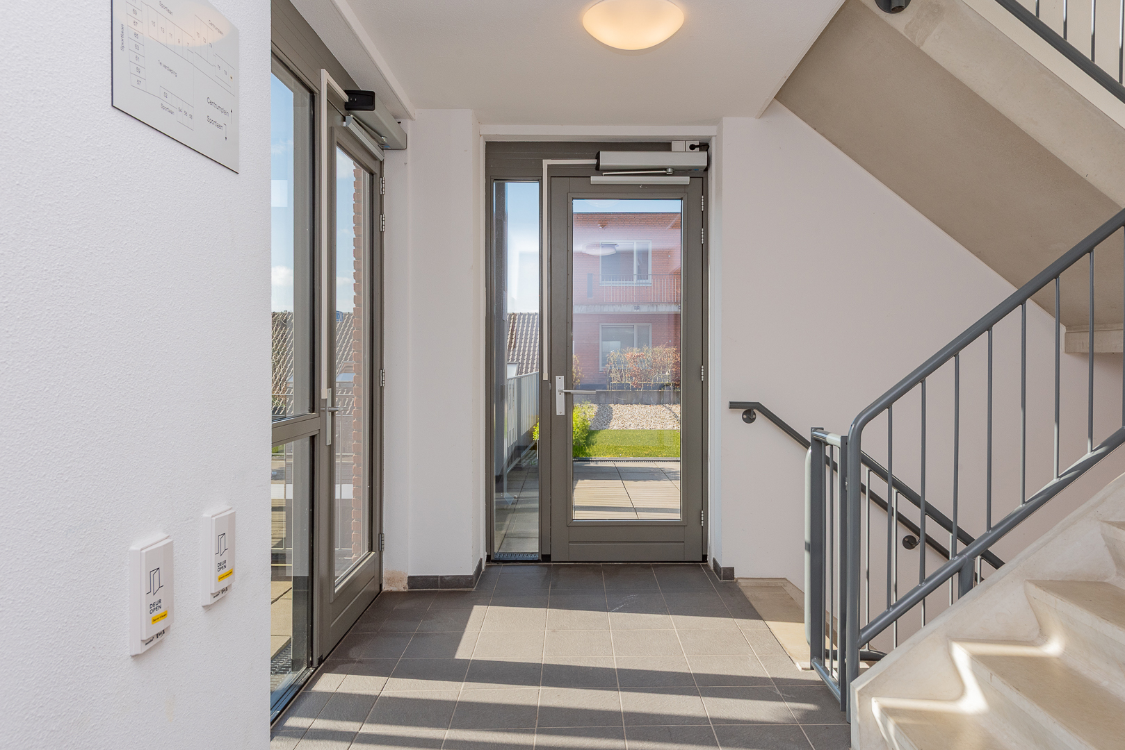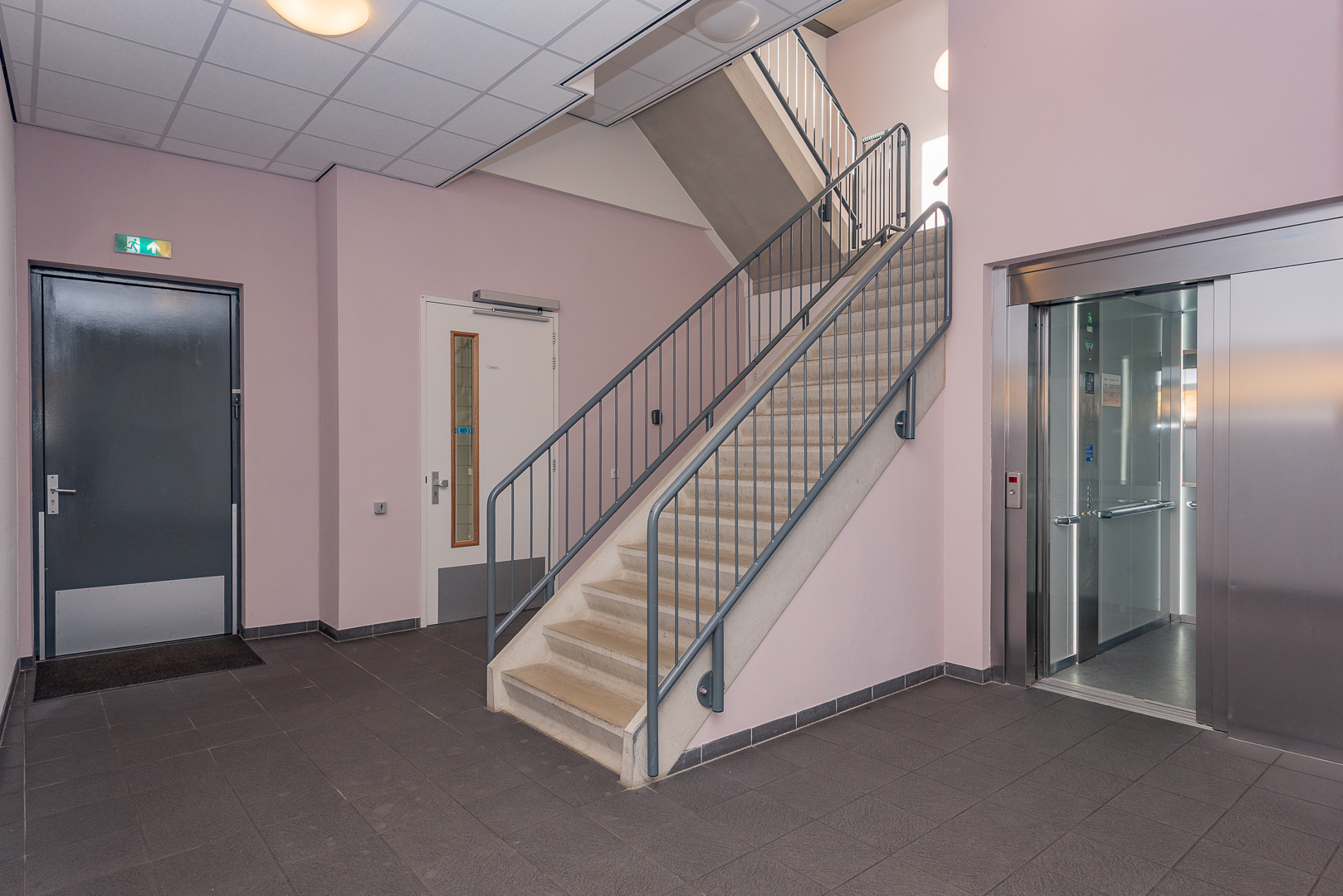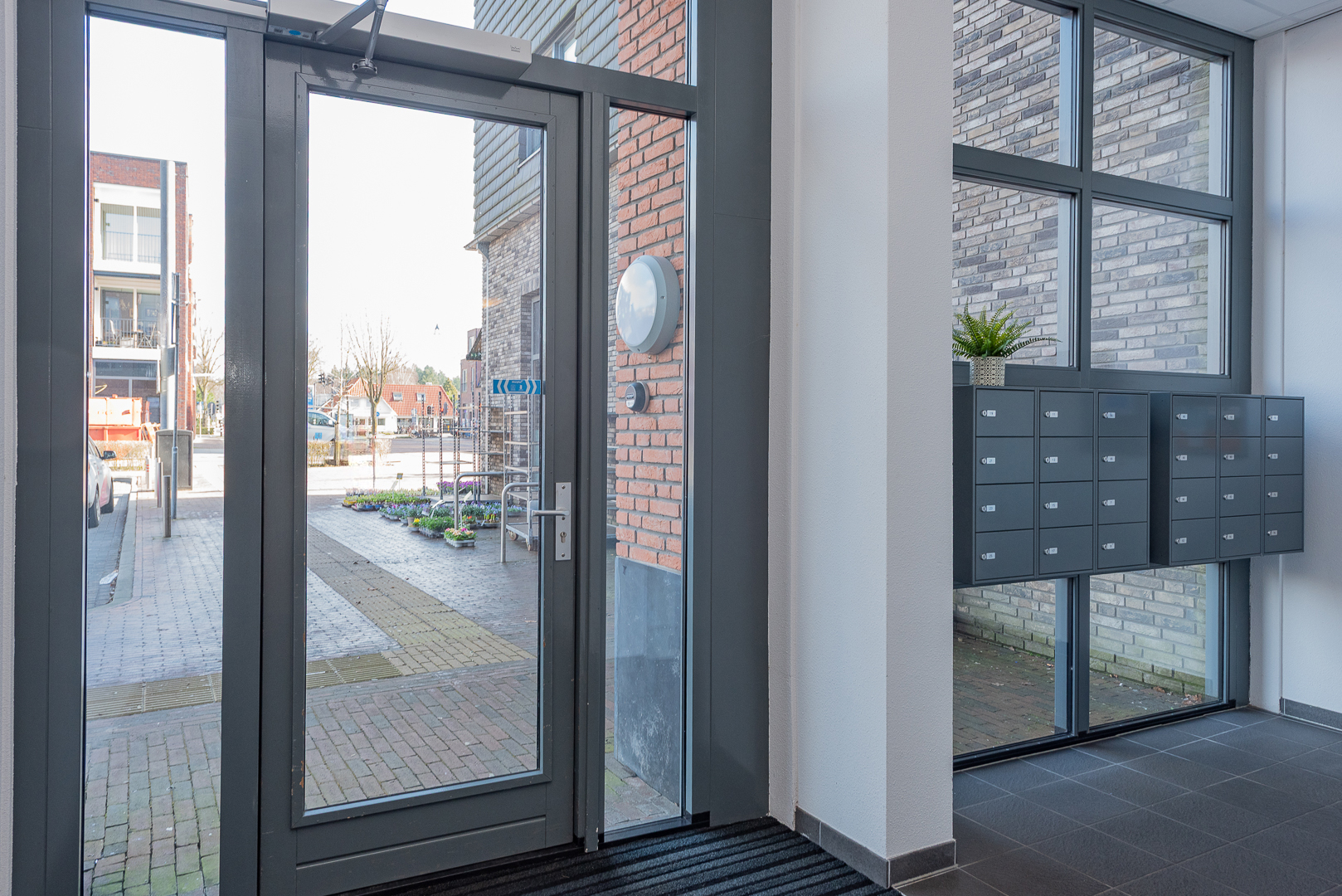 Gezamenlijk entree met brievenbussen en videofooninstallatie, trappenhuis en liftinstallatie, deur naar de bergingen en deur naar het parkeerterrein.