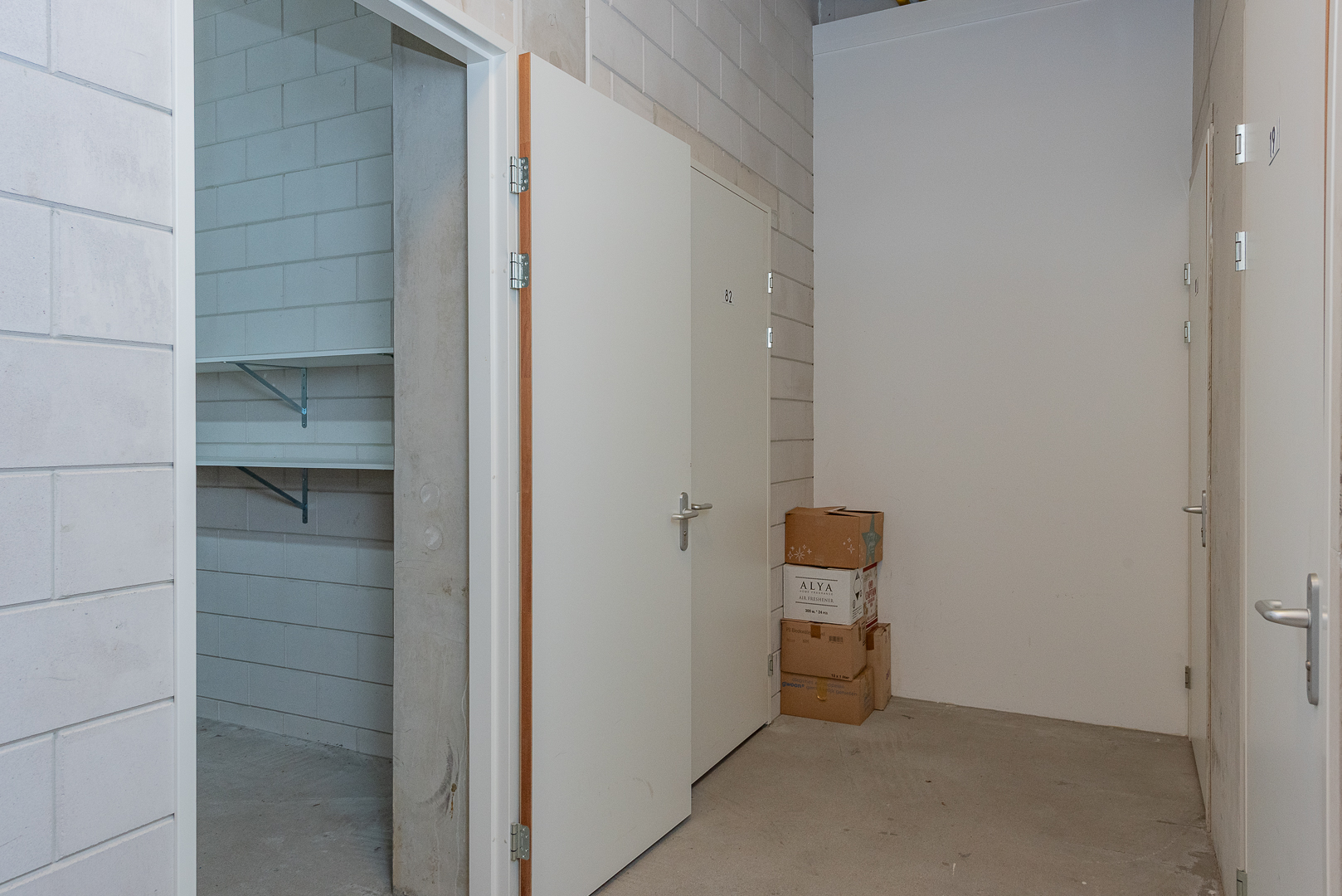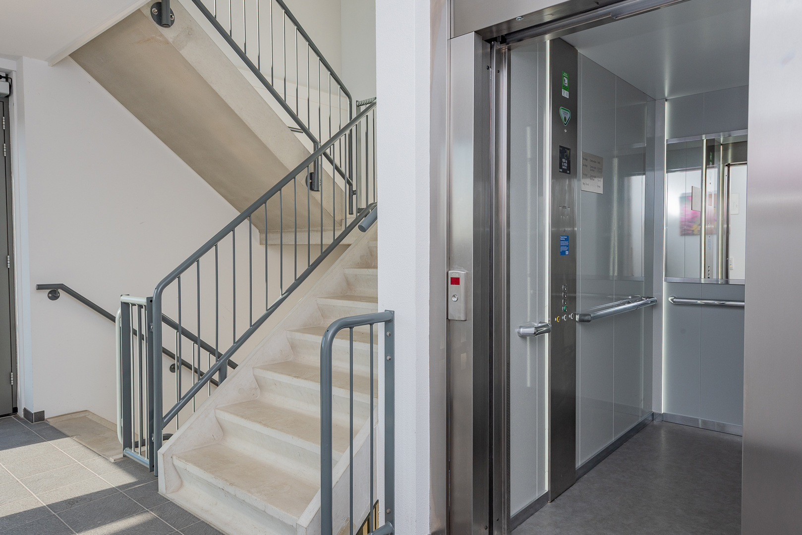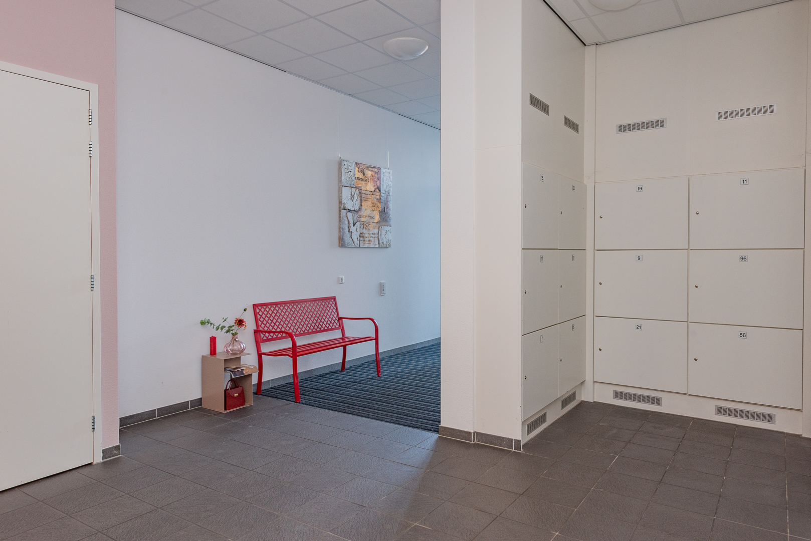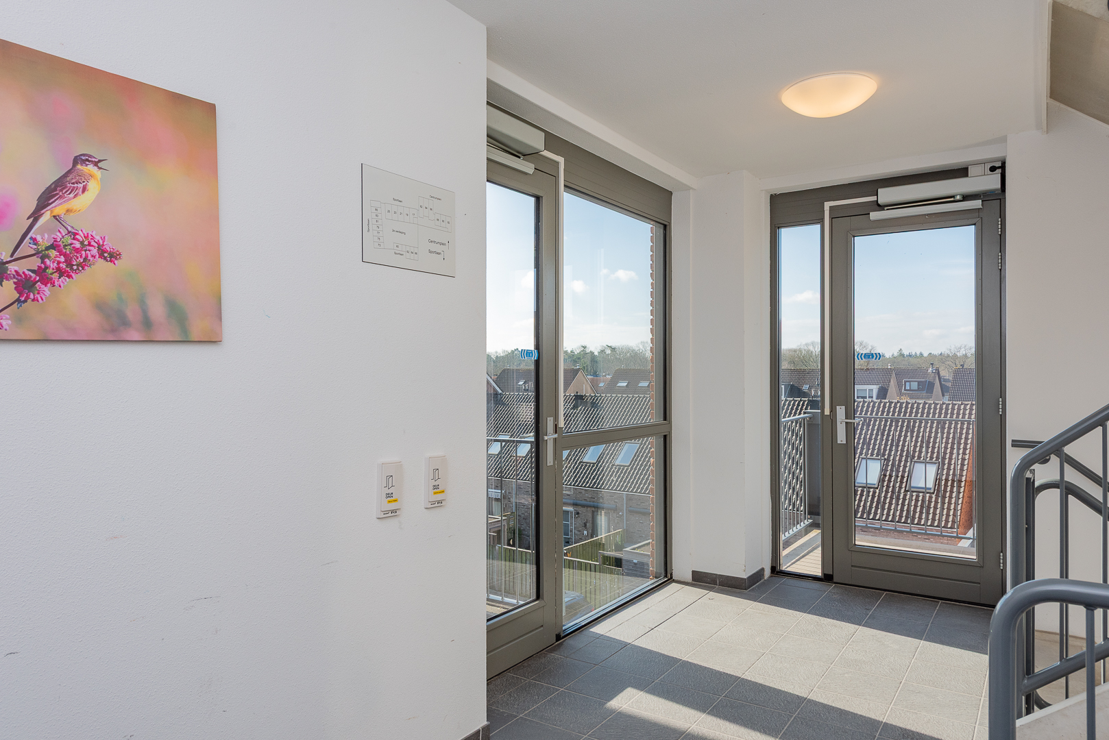 Gezamenlijk entree met brievenbussen en videofooninstallatie, trappenhuis en liftinstallatie, deur naar de bergingen en deur naar het parkeerterrein.