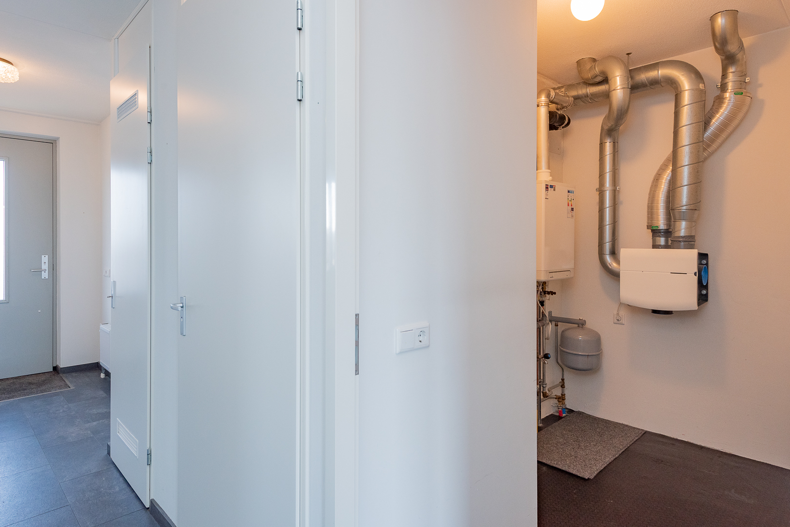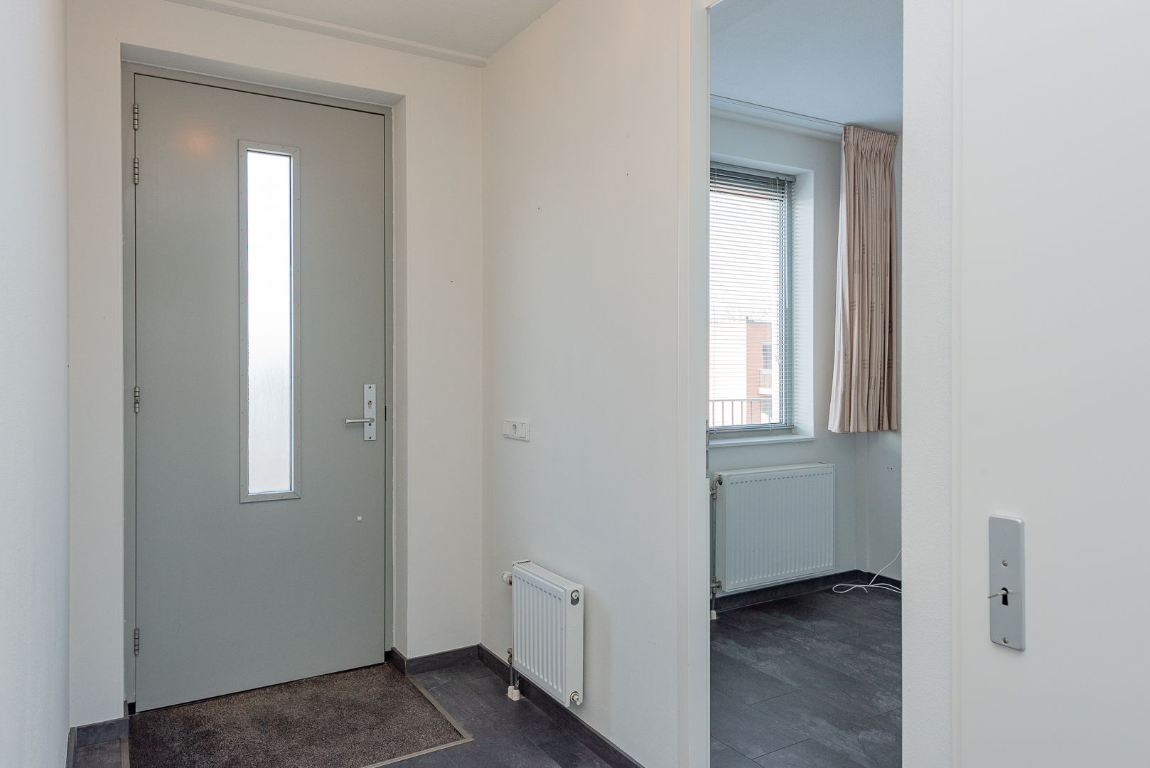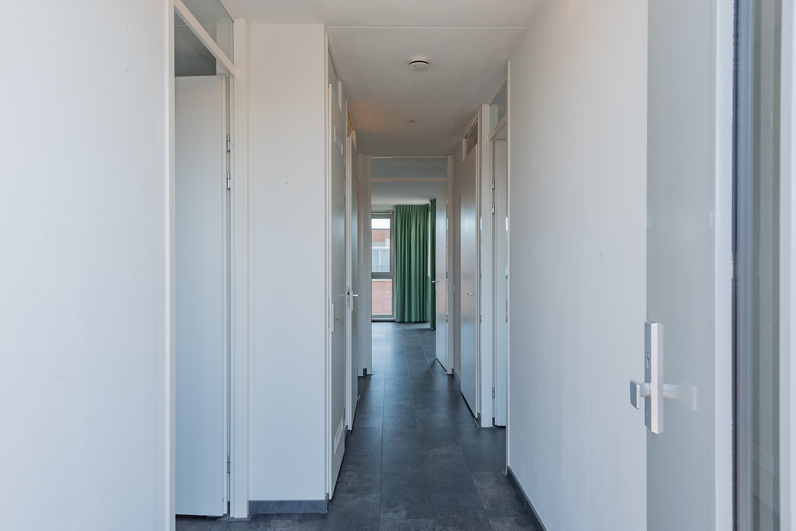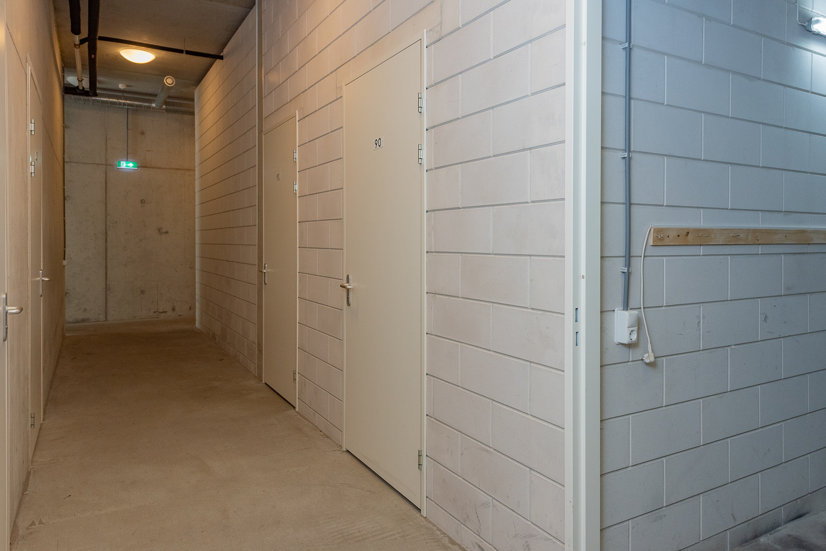 Gezamenlijk entree met brievenbussen en videofooninstallatie, trappenhuis en liftinstallatie, deur naar de bergingen en deur naar het parkeerterrein.