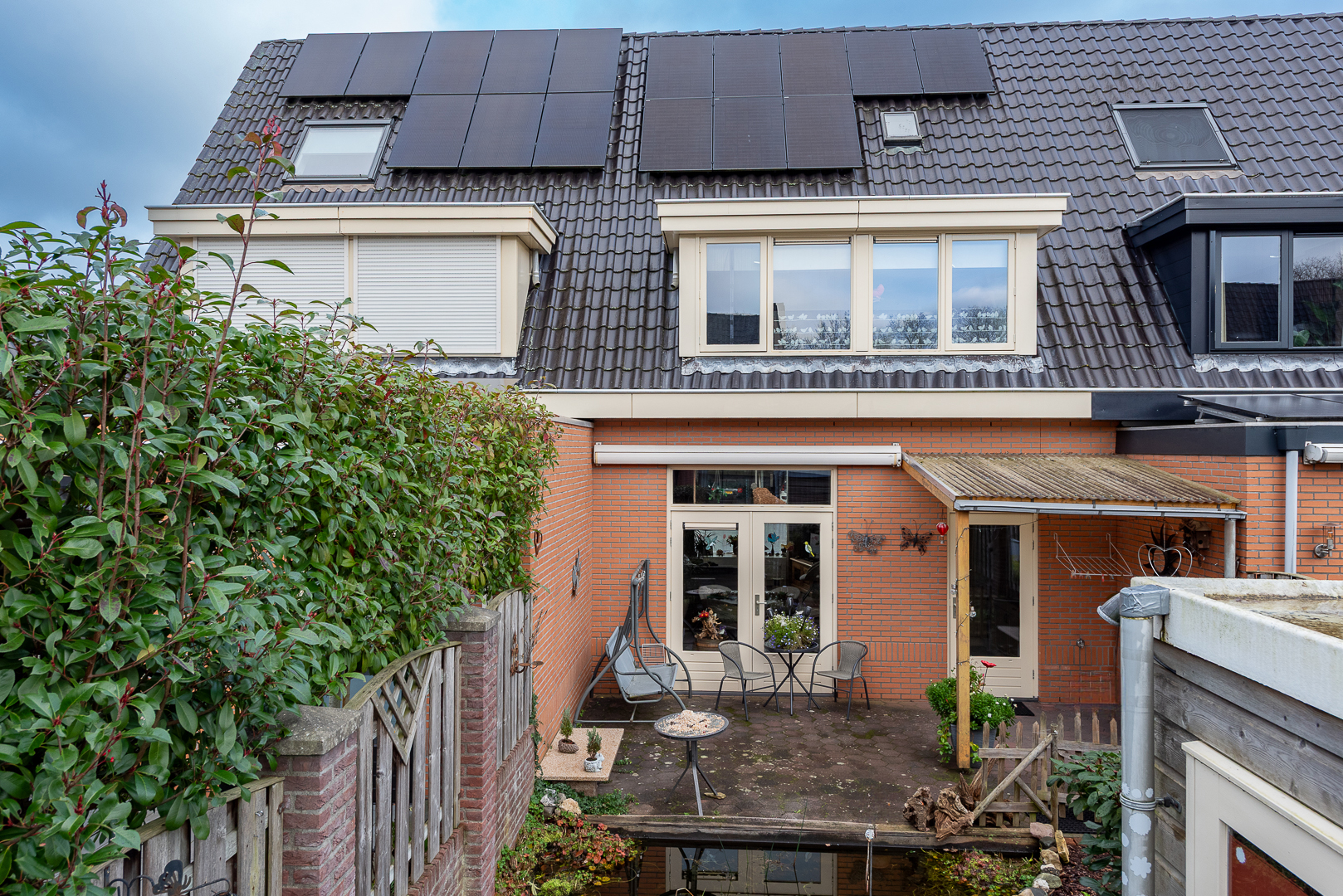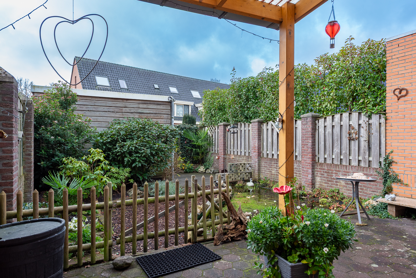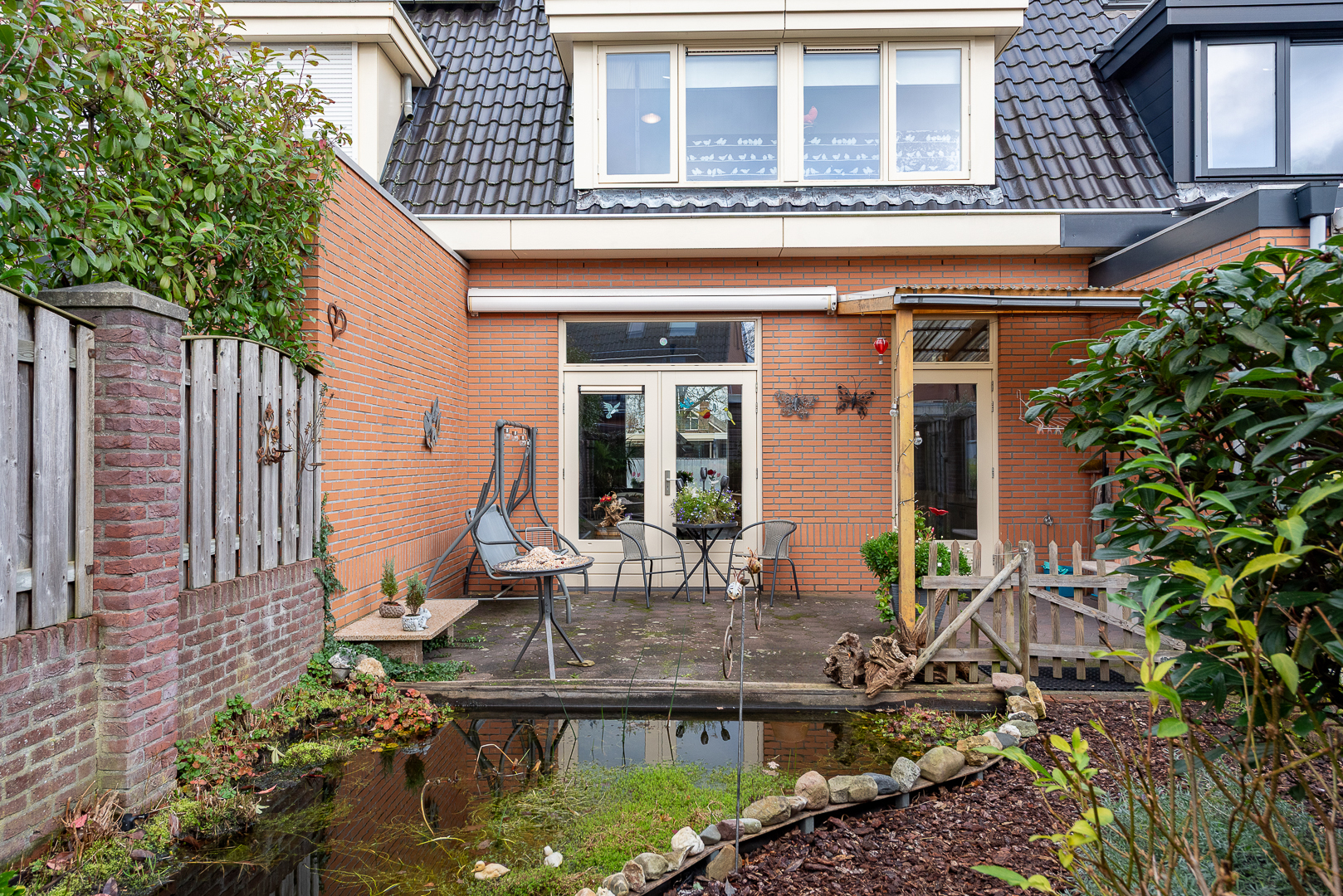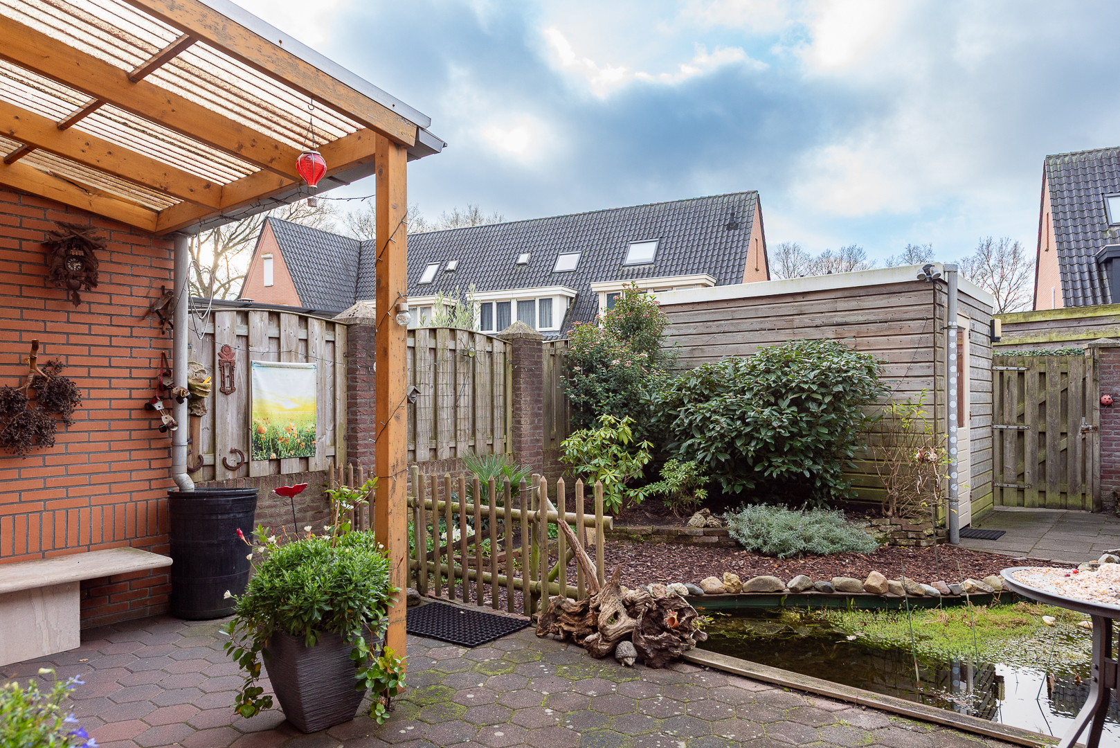 Gezellig aangelegde en zonnige achtertuin, gelegen op het zuidwesten. De tuin is ruim bemeten met ca. 11 meter diepte en ca. 6 meter breedte. De tuin is aangelegd met een groot zonneterras, welke deels is overkapt d.m.v. een luifel van 2.25 meter x 2.25 meter. Het overige deel beschikt over een zonnescherm. Verder is de tuin aangelegd met sierbestrating, tuinbeplanting, een vijver en een boomschors wandelpad. Achterin de tuin staat een houten tuinberging van ca. 9 m² v.v. elektra, ideaal als extra opslag. De achtertuin is bereikbaar via een achterom. De voortuin is eveneens verzorgd en gezellig aangelegd.