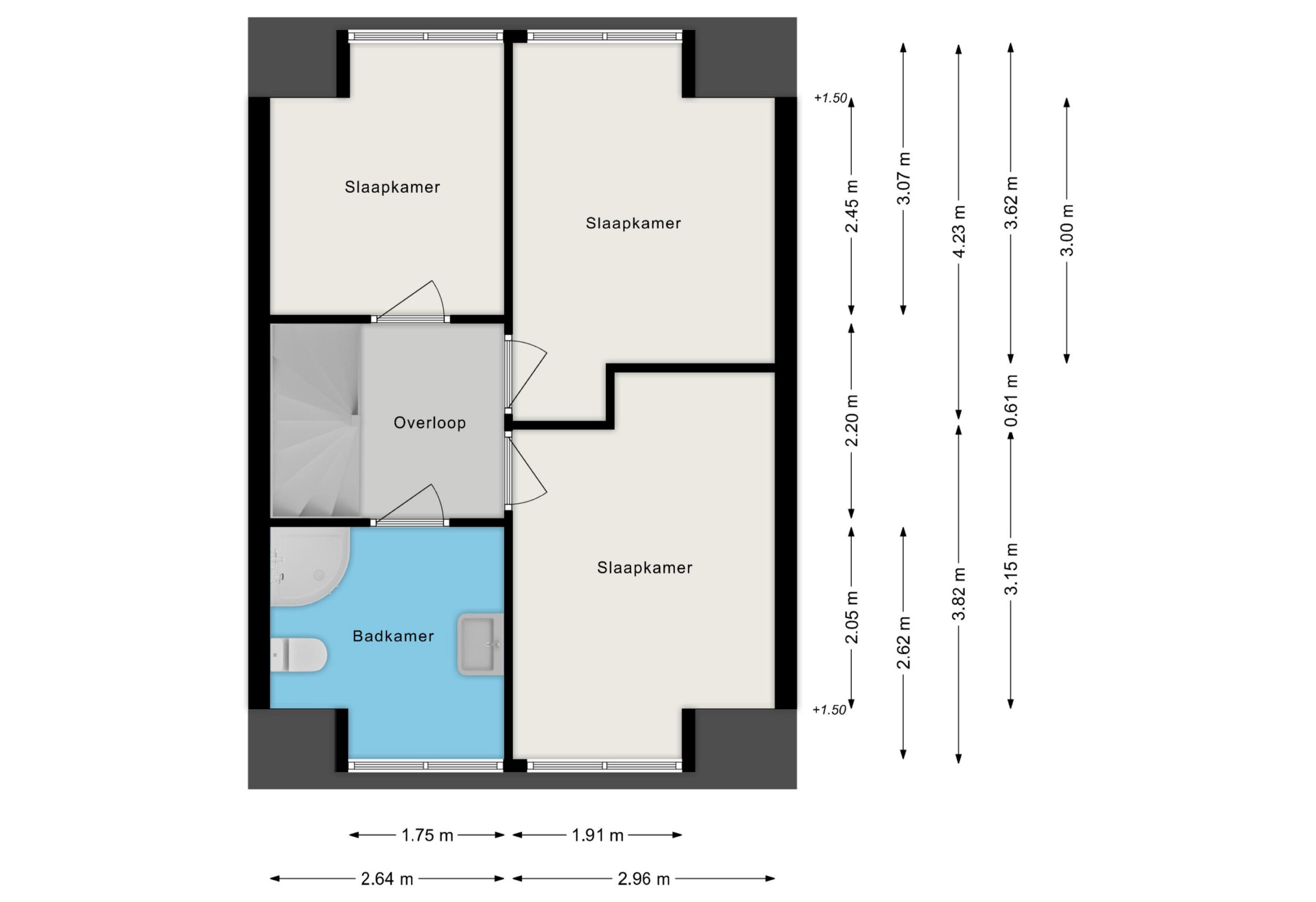 Ruime overloop met trappen naar de andere twee etages, kinderslaapkamer aan de achterzijde van ca. 8 m², tweede ruime slaapkamer aan de achterzijde van ca. 11 m², derde slaapkamer aan de voorzijde van ca. 12 m², licht betegelde badkamer v.v. waskom, staand closet en douchehoek. Alle vertrekken zijn v.v. een grote dakkapel voor extra daglicht en stahoogte.