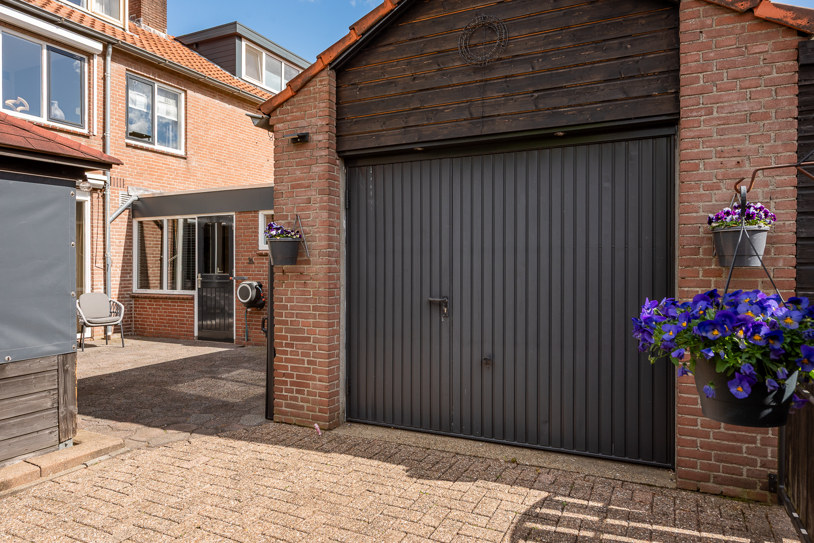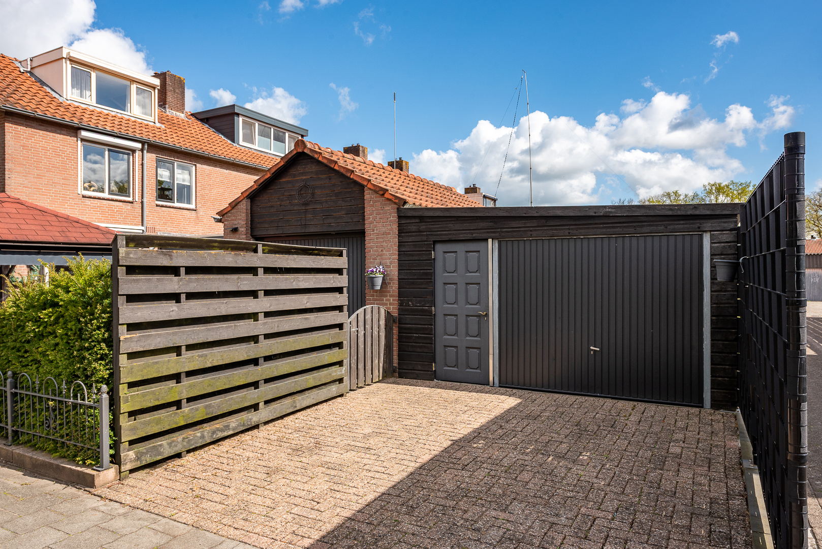 Achter de berging staat een houten garage van ca. 4.30 meter breed x 5.85 meter diep waar dankzij de aanwezigheid van een garagedeur met gemak een auto geparkeerd kan worden. Voor de garage ligt nog een ruime oprit waar nog eens een plek is voor een auto.