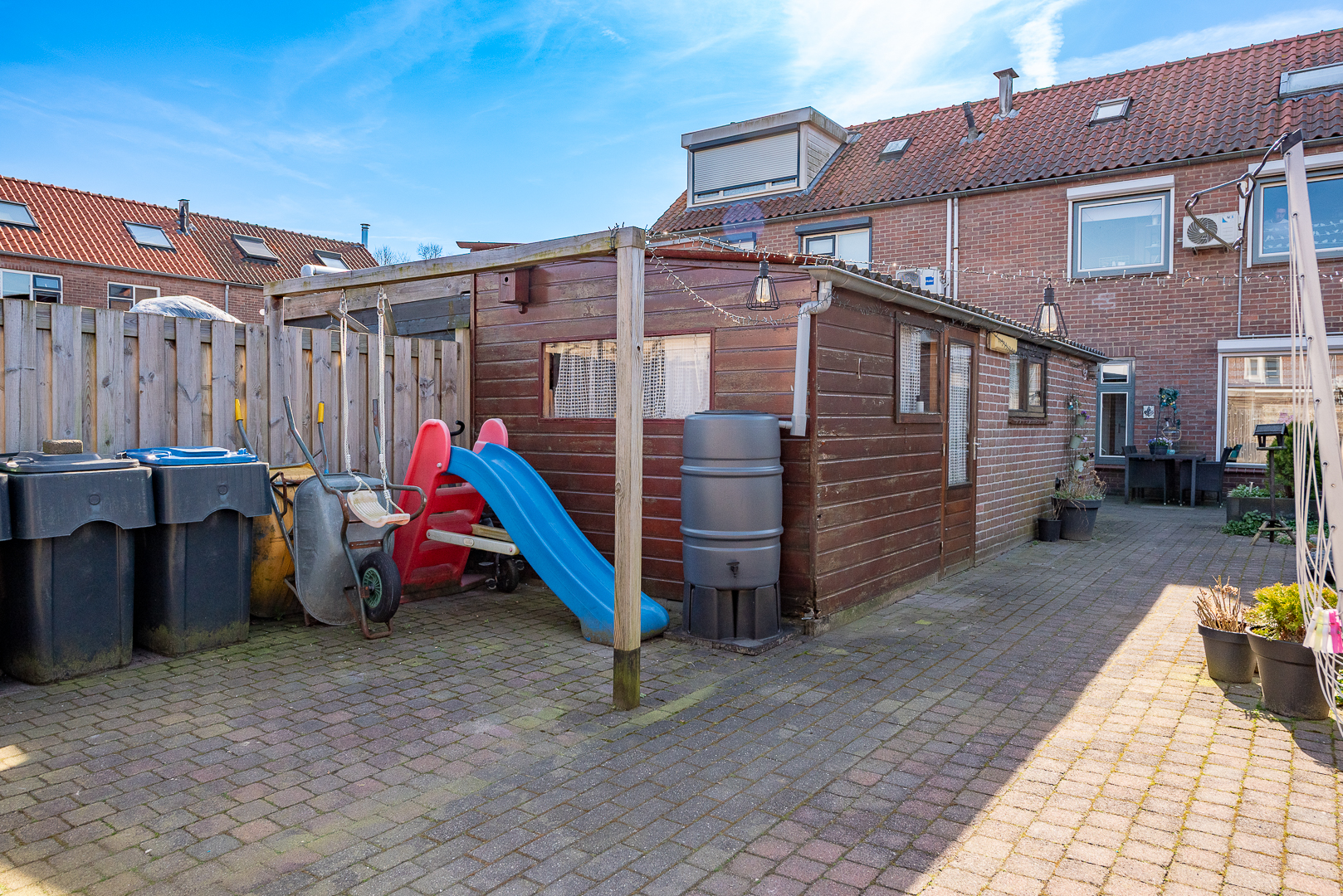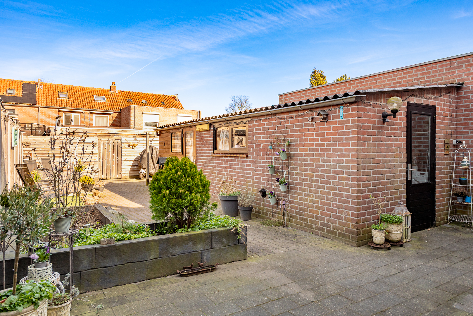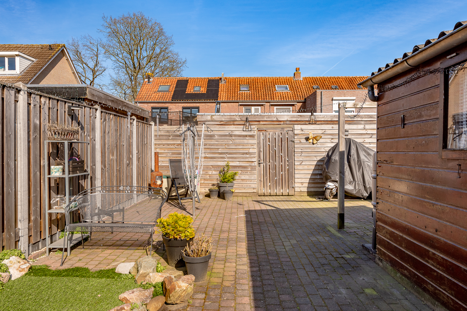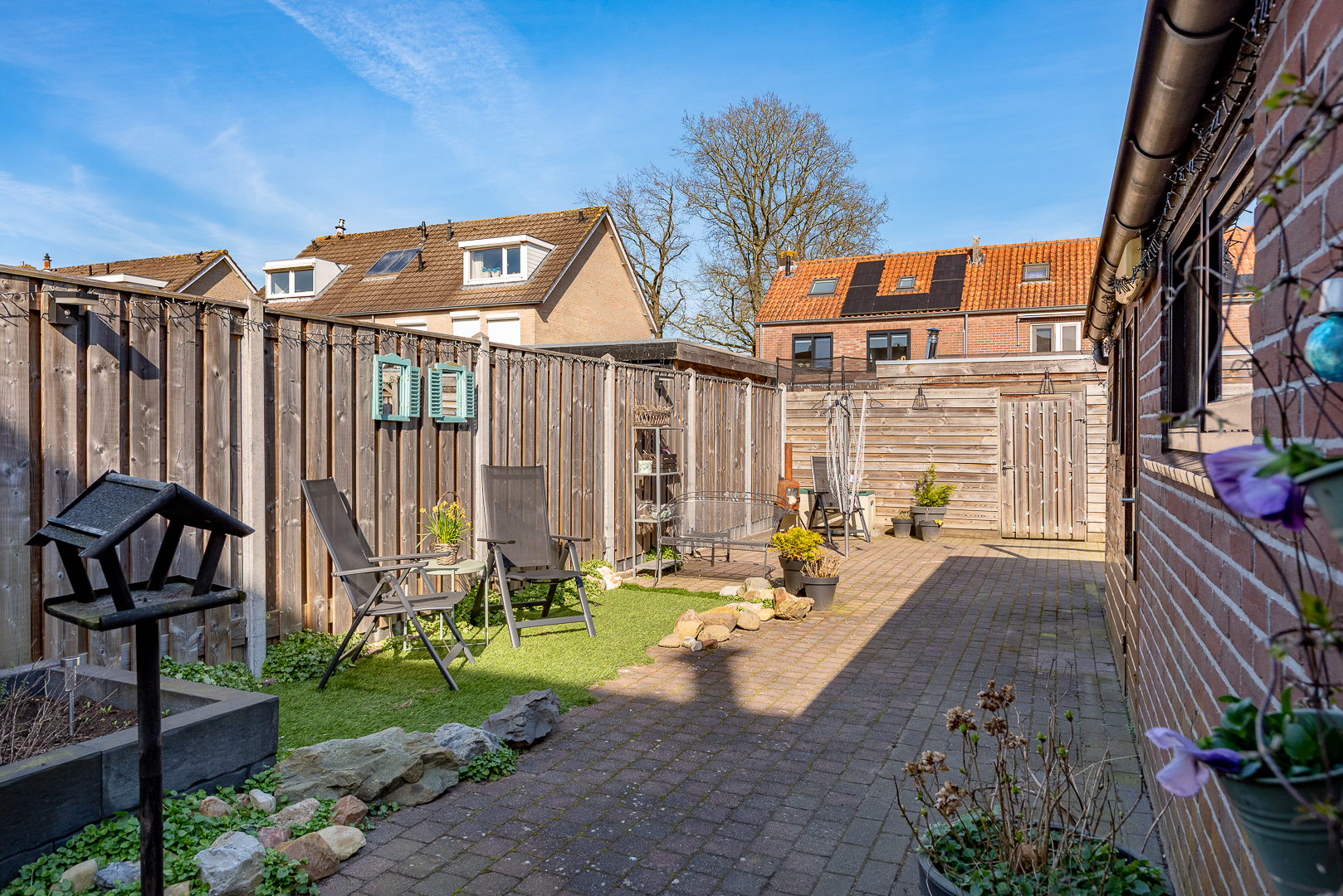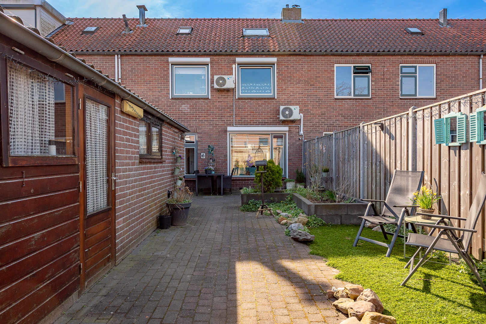 De diepe achtertuin kent een oostelijk georiënteerde ligging, wat voornamelijk betekent dat er een ochtend-/middagzon aanwezig is in de tuin. De tuin heeft met bijna 120 m² een bovengemiddeld grote oppervlakte en is bereikbaar via een achterom. In de achtertuin staat een stenen berging van ca. 4.80 meter x 2.75 meter v.v. elektra en een houten berging van ca. 2.90 meter x 2.70 meter eveneens v.v. elektra. Voor de woning ligt er nog een knusse voortuin. De tuin kent een onderhoudsarm karakter.