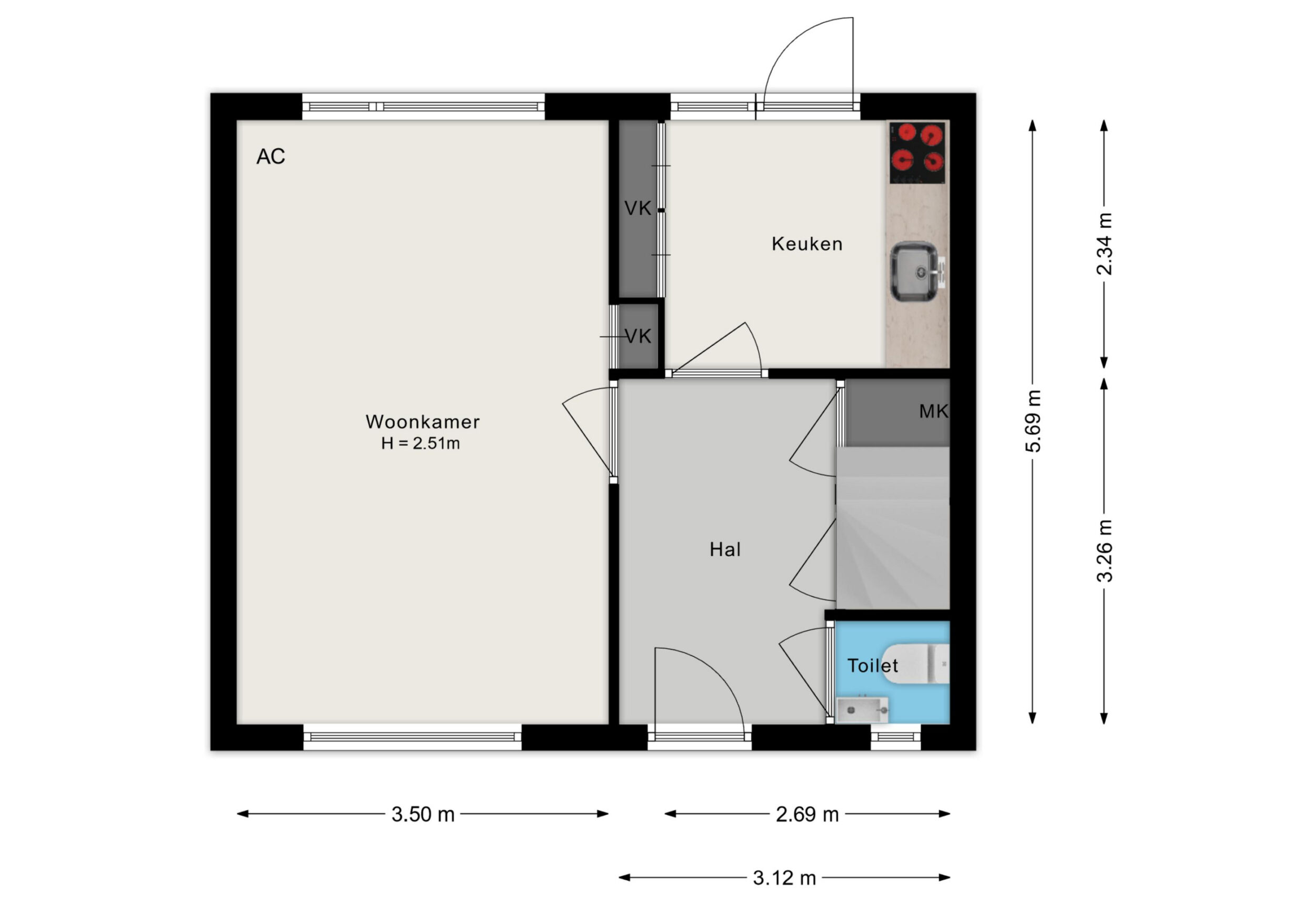 Entree, ruime hal met trapopgang naar de eerste verdieping, toiletruimte v.v. staand toilet en fonteintje, kelderkast / provisiekast / meterkast onder de trapopgang, deur naar de keuken van ca. 6.50 m² v.v. eenvoudige keukenopstelling met beperkte apparatuur, kastenwand, opstelplaats wasmachine, deur naar de achtertuin deur vanuit de hal naar de doorzon woonkamer van ca. 20 m² met airconditioning en rolluiken.