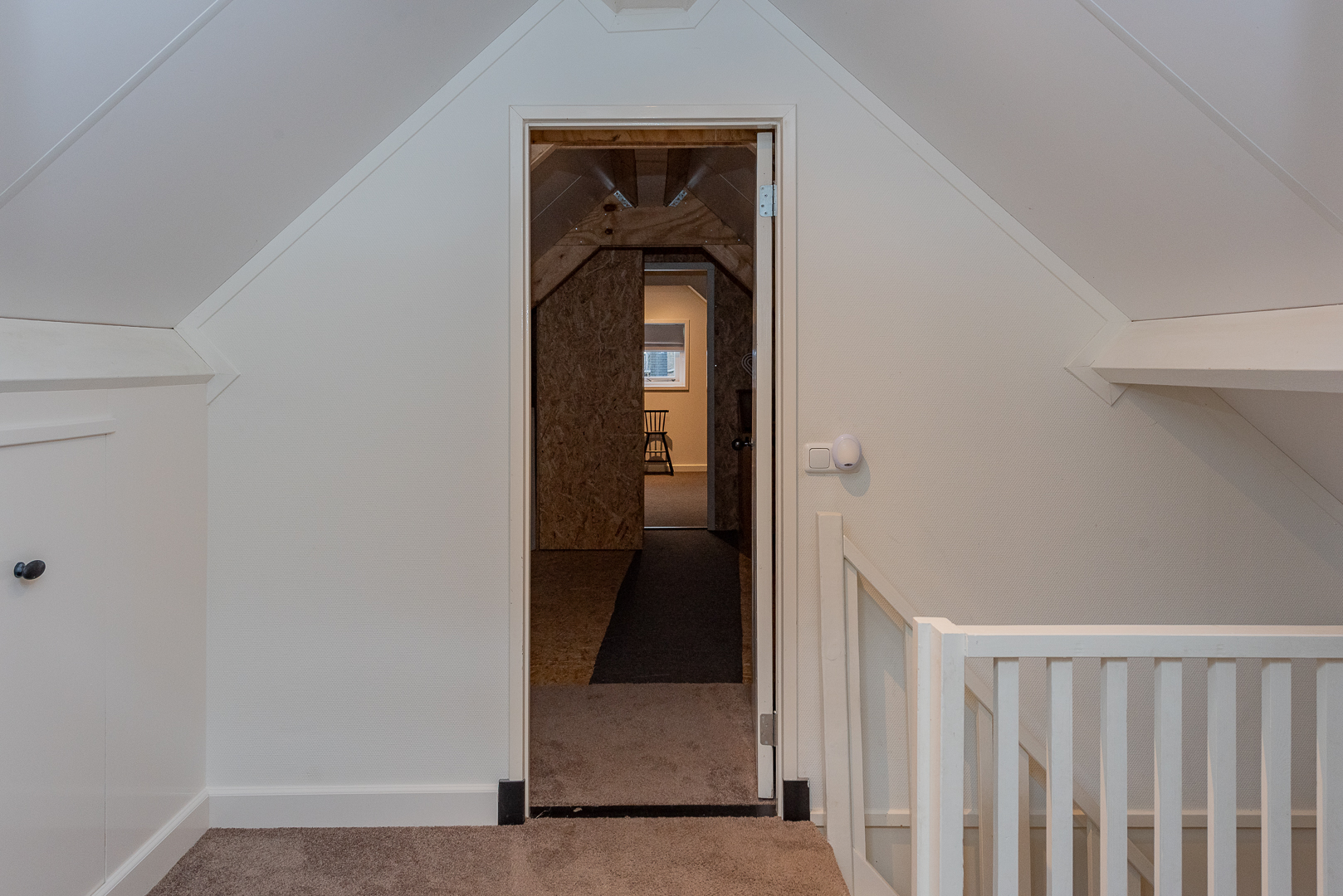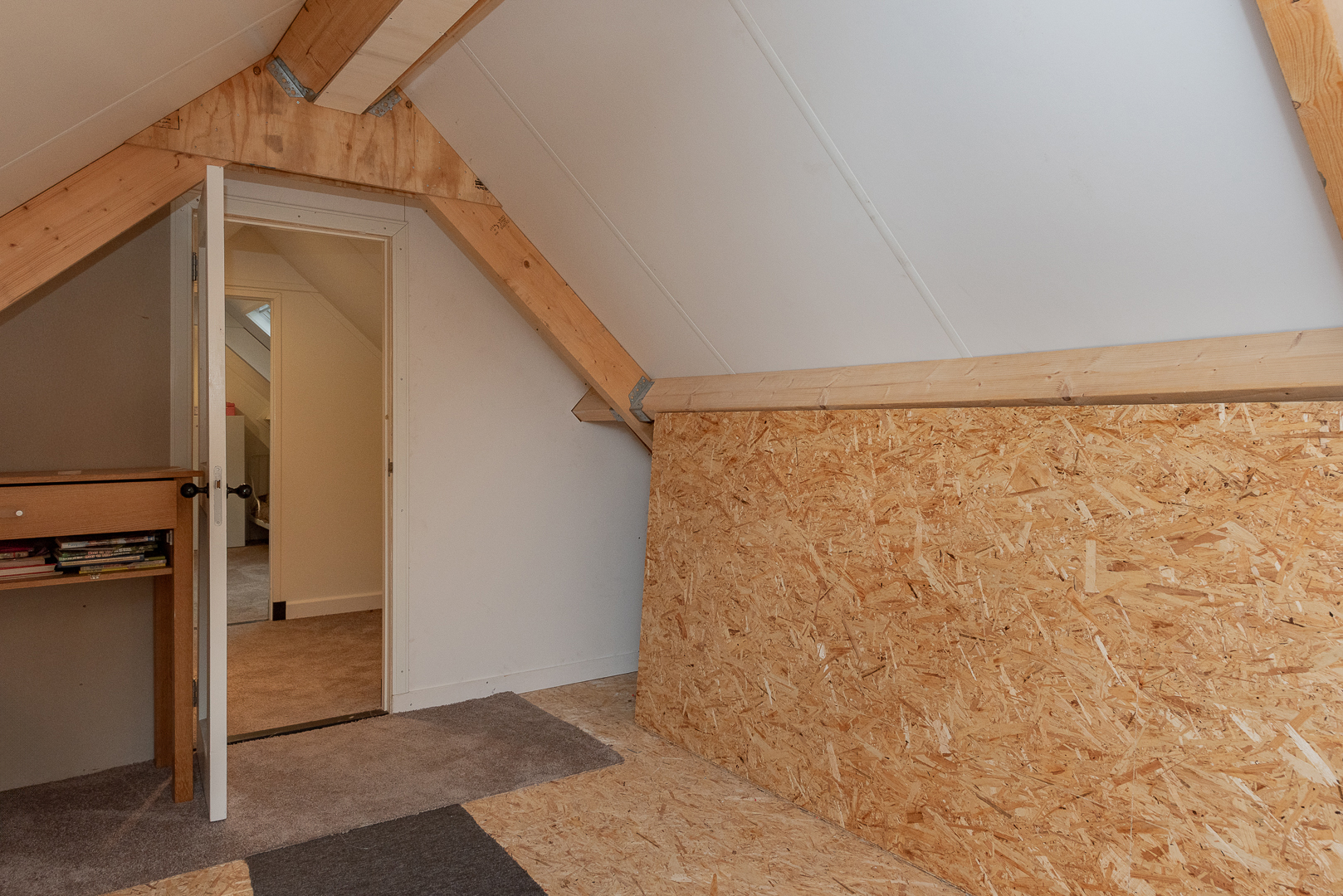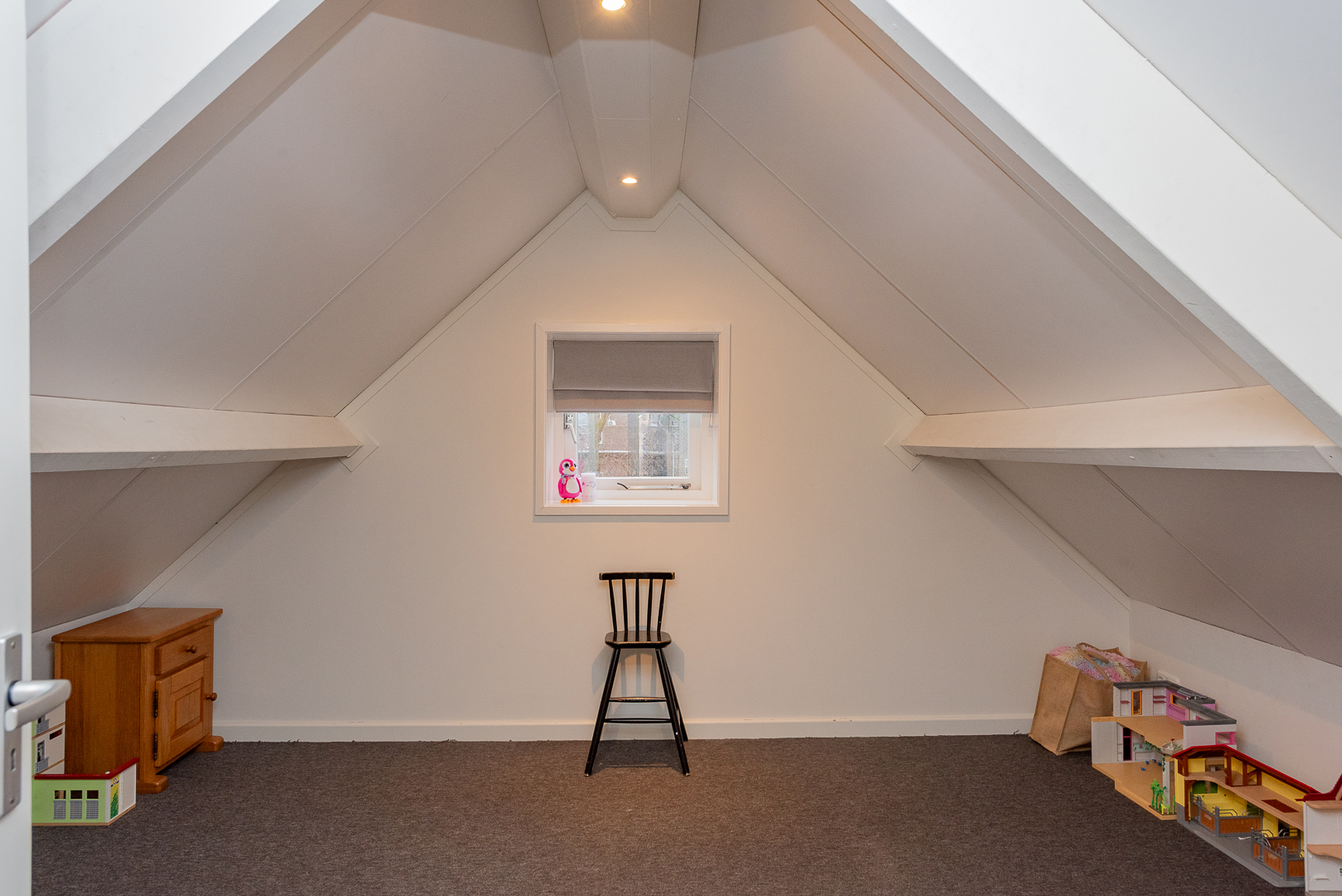 Overloop met bergruimte achter de knieschotten, gezellige slaapkamer met tuimeldakraam en bergruimte achter de knieschotten, grote overloop / speelruimte en doorgang naar tweede ruime slaapkamer.