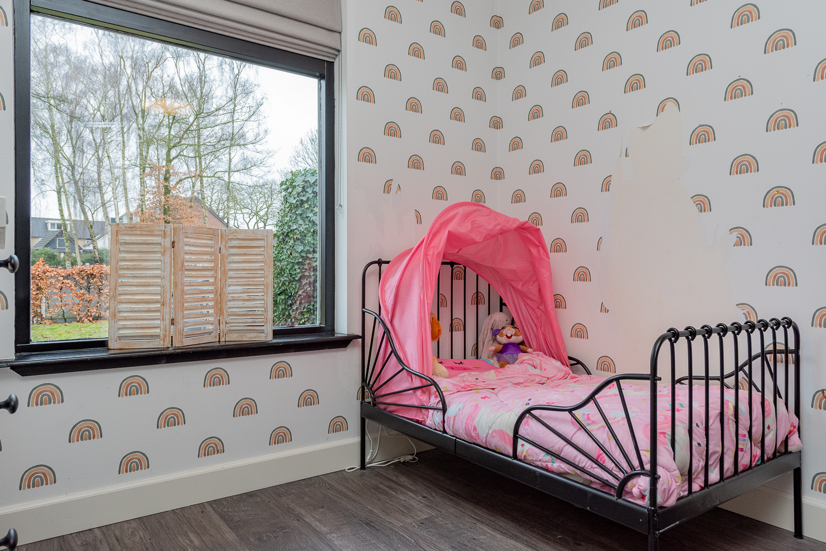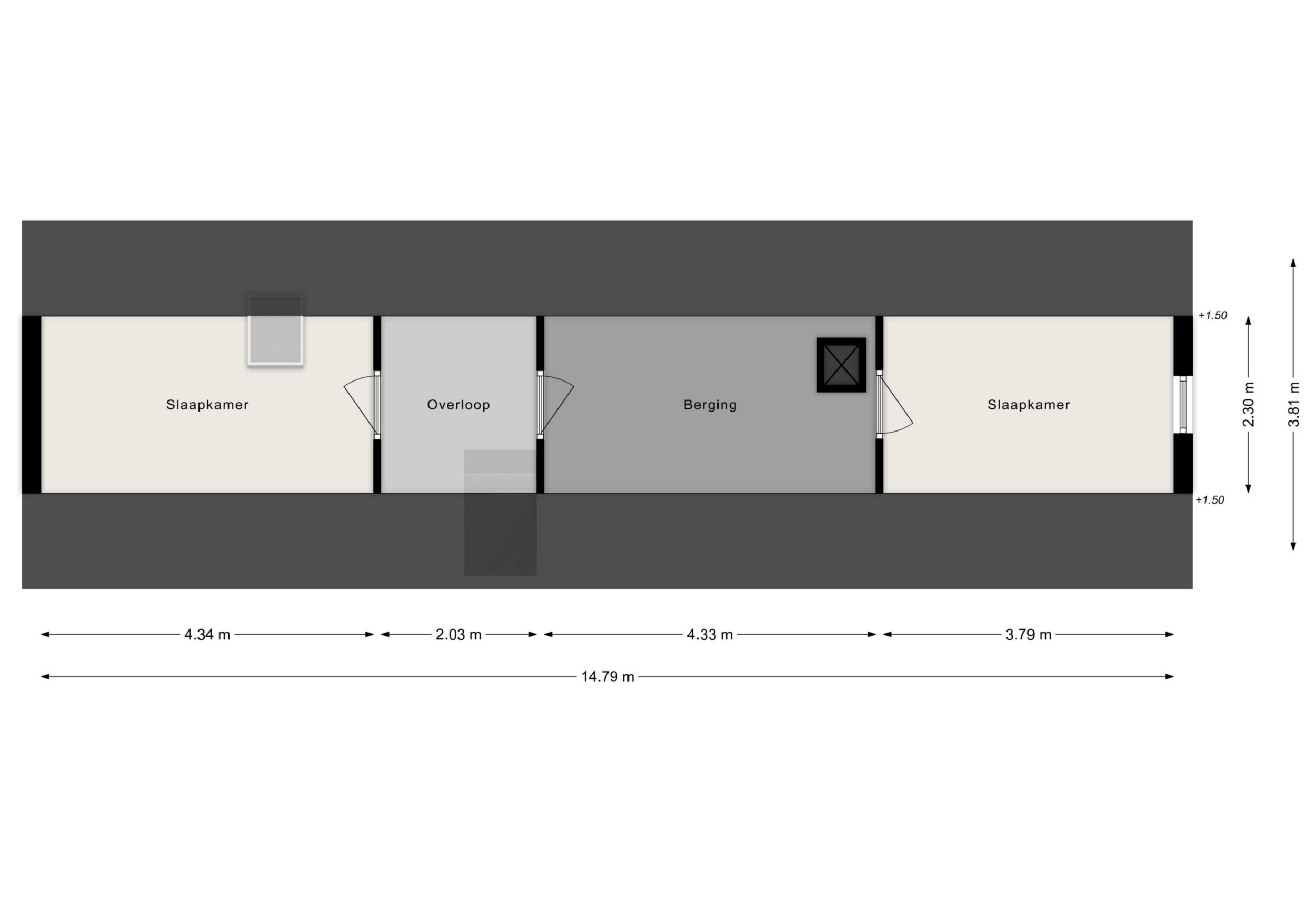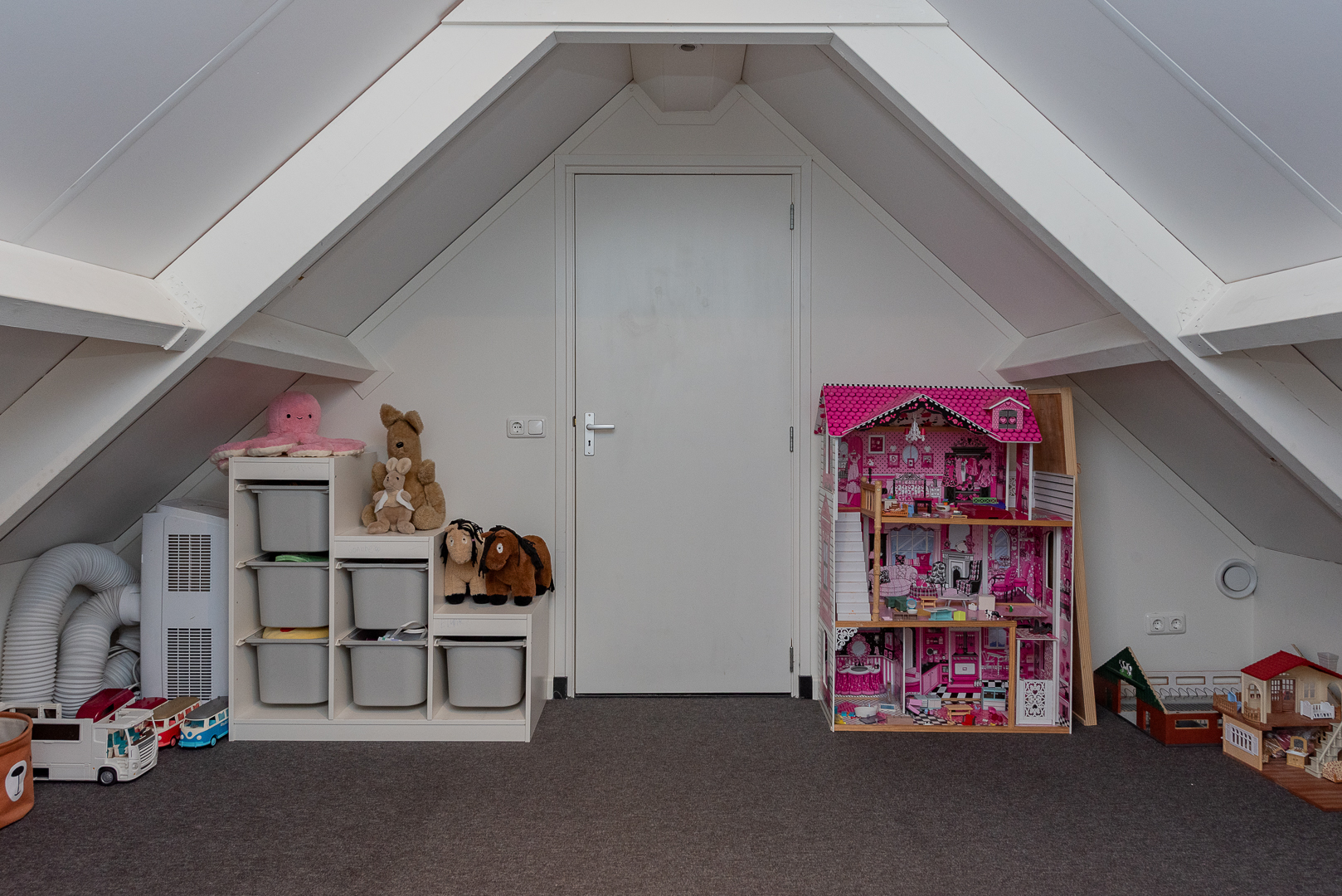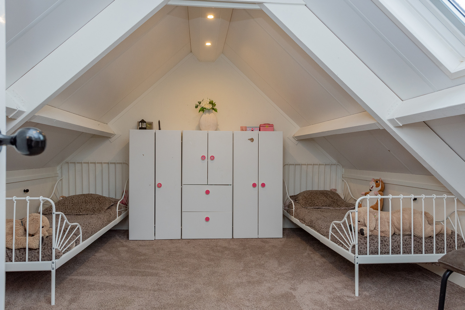 Overloop met bergruimte achter de knieschotten, gezellige slaapkamer met tuimeldakraam en bergruimte achter de knieschotten, grote overloop / speelruimte en doorgang naar tweede ruime slaapkamer.