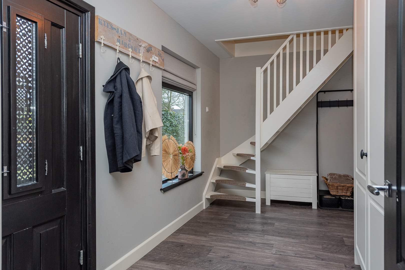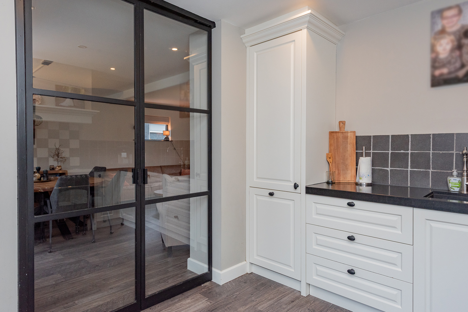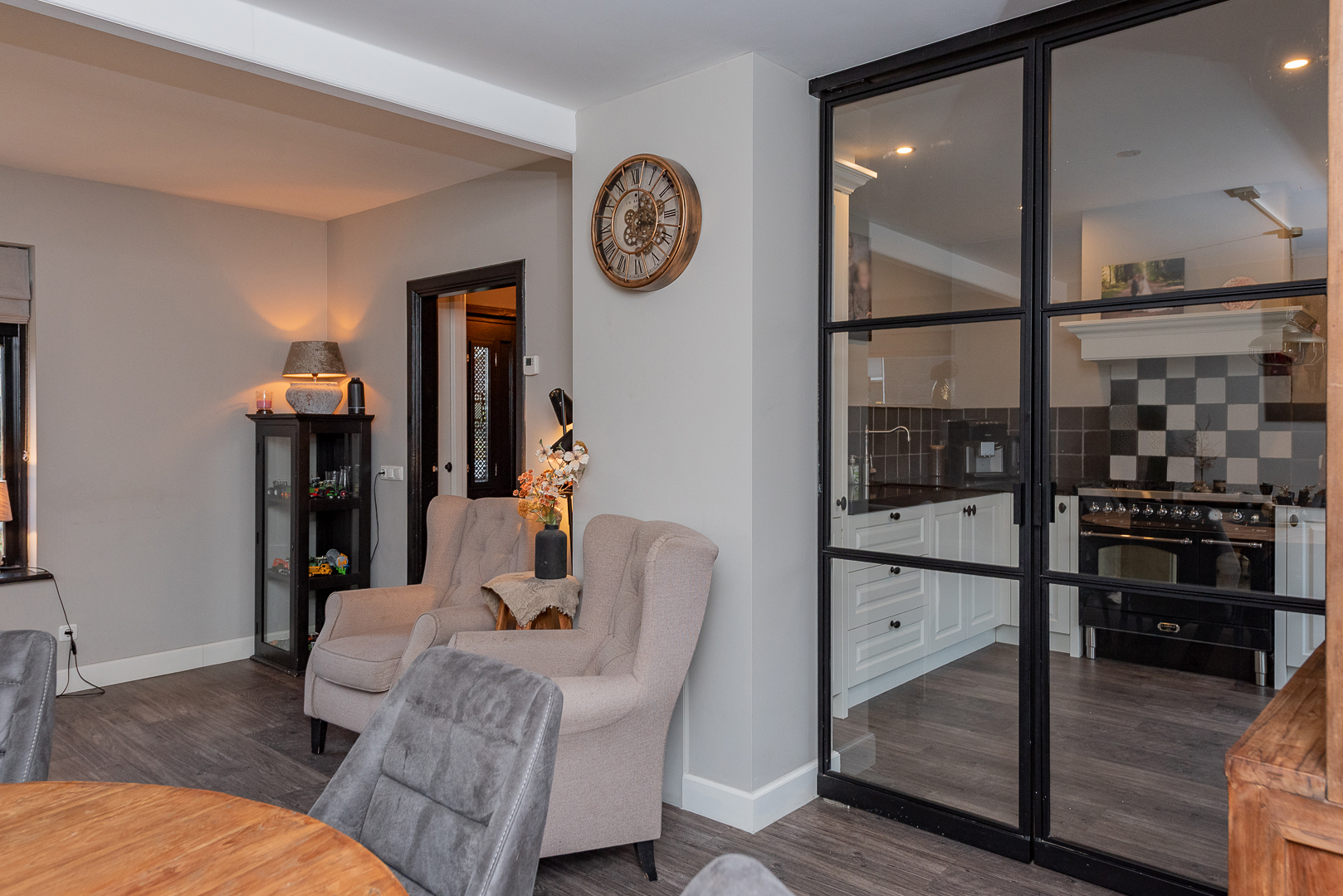 Entree, hal / verkeersruimte, bergkast onder de trap, praktische vaste kasten, meterkast, gezellige woonkamer met een straatgerichte zitkamer en mooi uitzicht. Tuingerichte eetkamer en aansluitend de open keuken gescheiden van de eetkamer d.m.v. fraaie taatsdeuren. De keuken is voorzien van een luxe inbouwkeuken met diverse inbouwapparatuur. Tuindeuren vanuit de keuken naar de achtertuin.