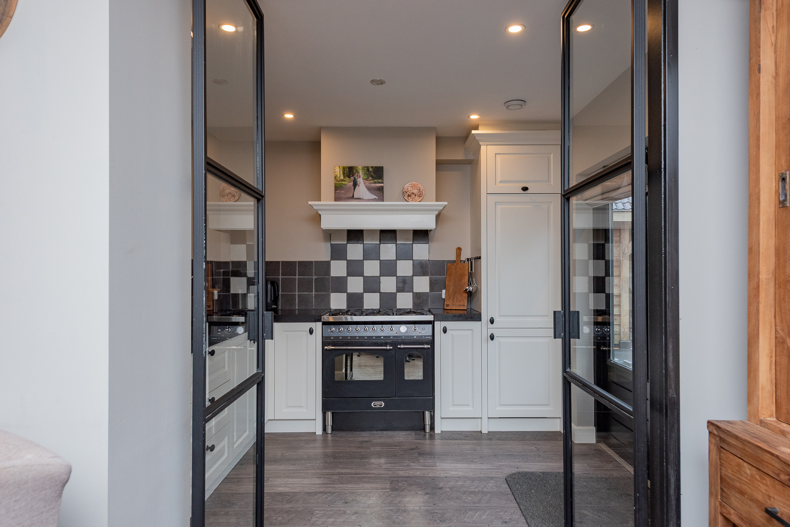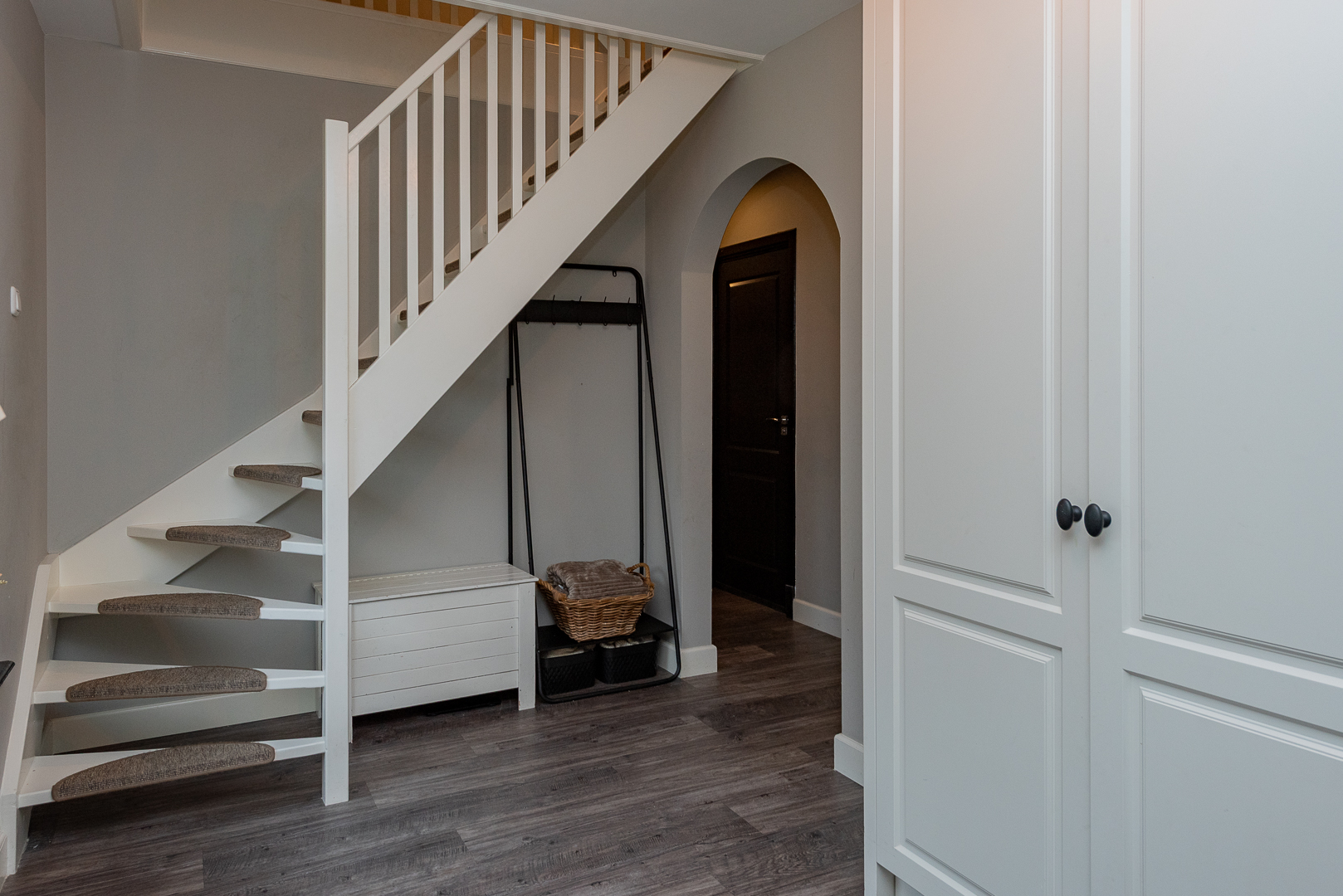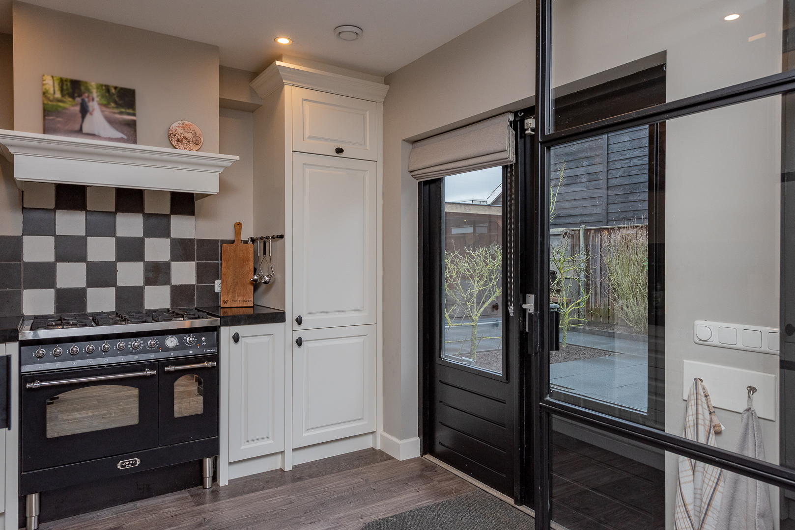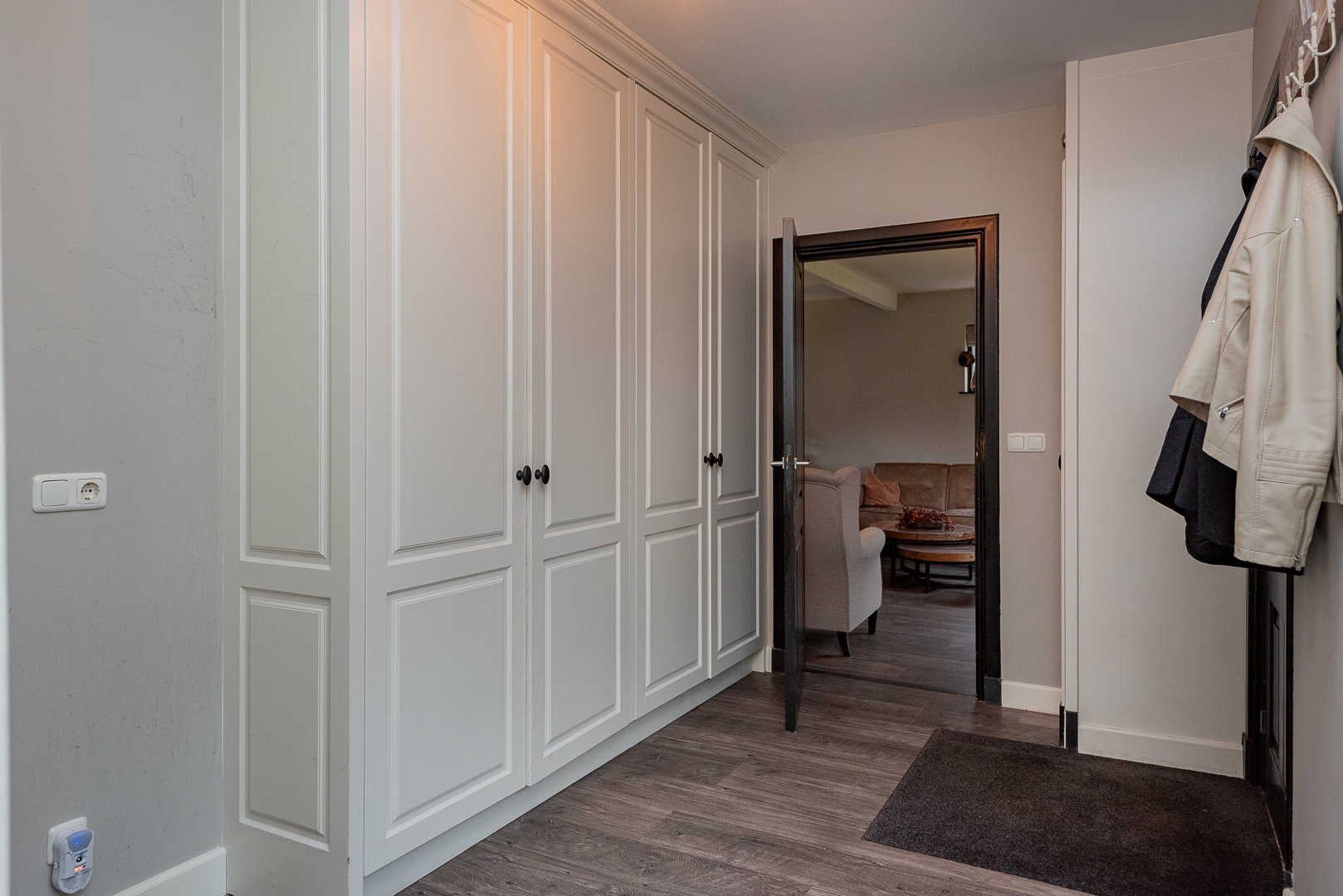 Entree, hal / verkeersruimte, bergkast onder de trap, praktische vaste kasten, meterkast, gezellige woonkamer met een straatgerichte zitkamer en mooi uitzicht. Tuingerichte eetkamer en aansluitend de open keuken gescheiden van de eetkamer d.m.v. fraaie taatsdeuren. De keuken is voorzien van een luxe inbouwkeuken met diverse inbouwapparatuur. Tuindeuren vanuit de keuken naar de achtertuin.