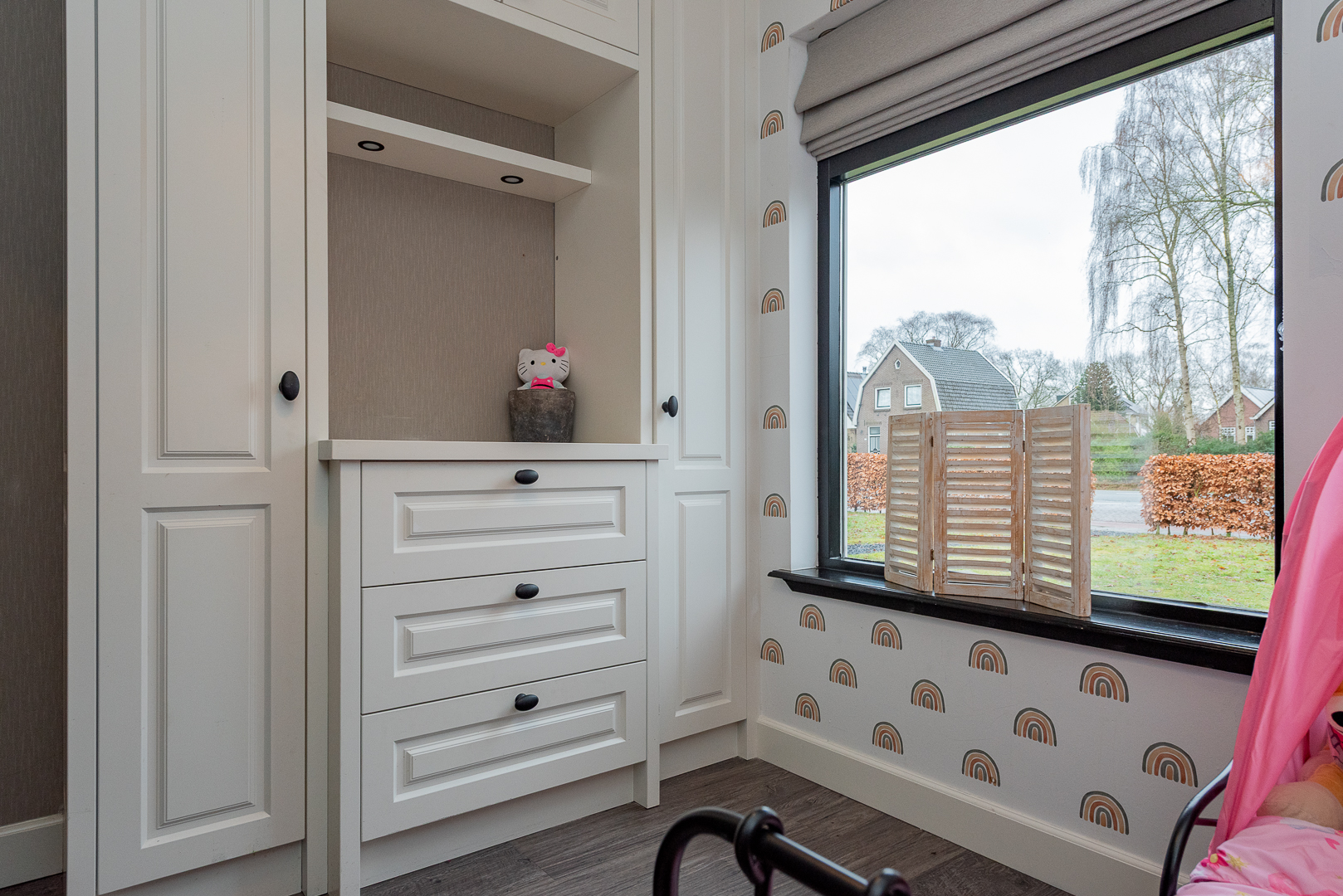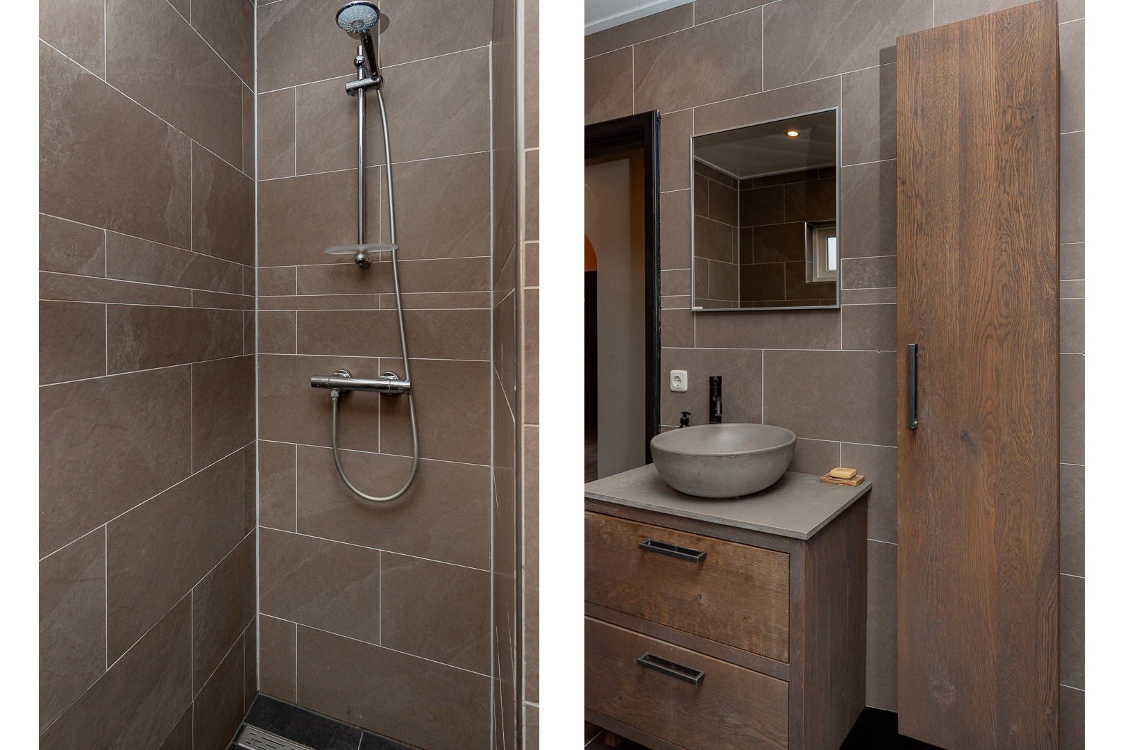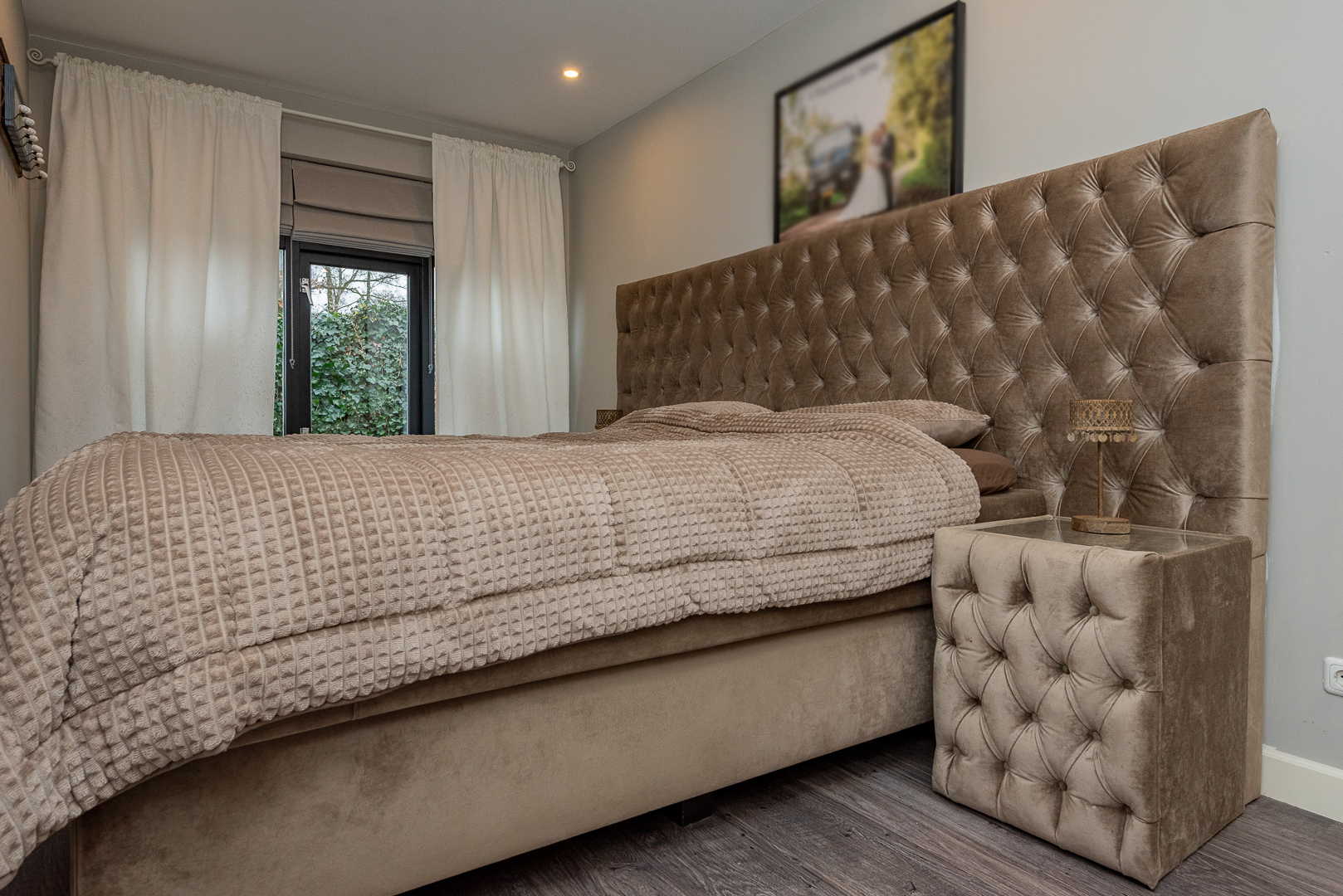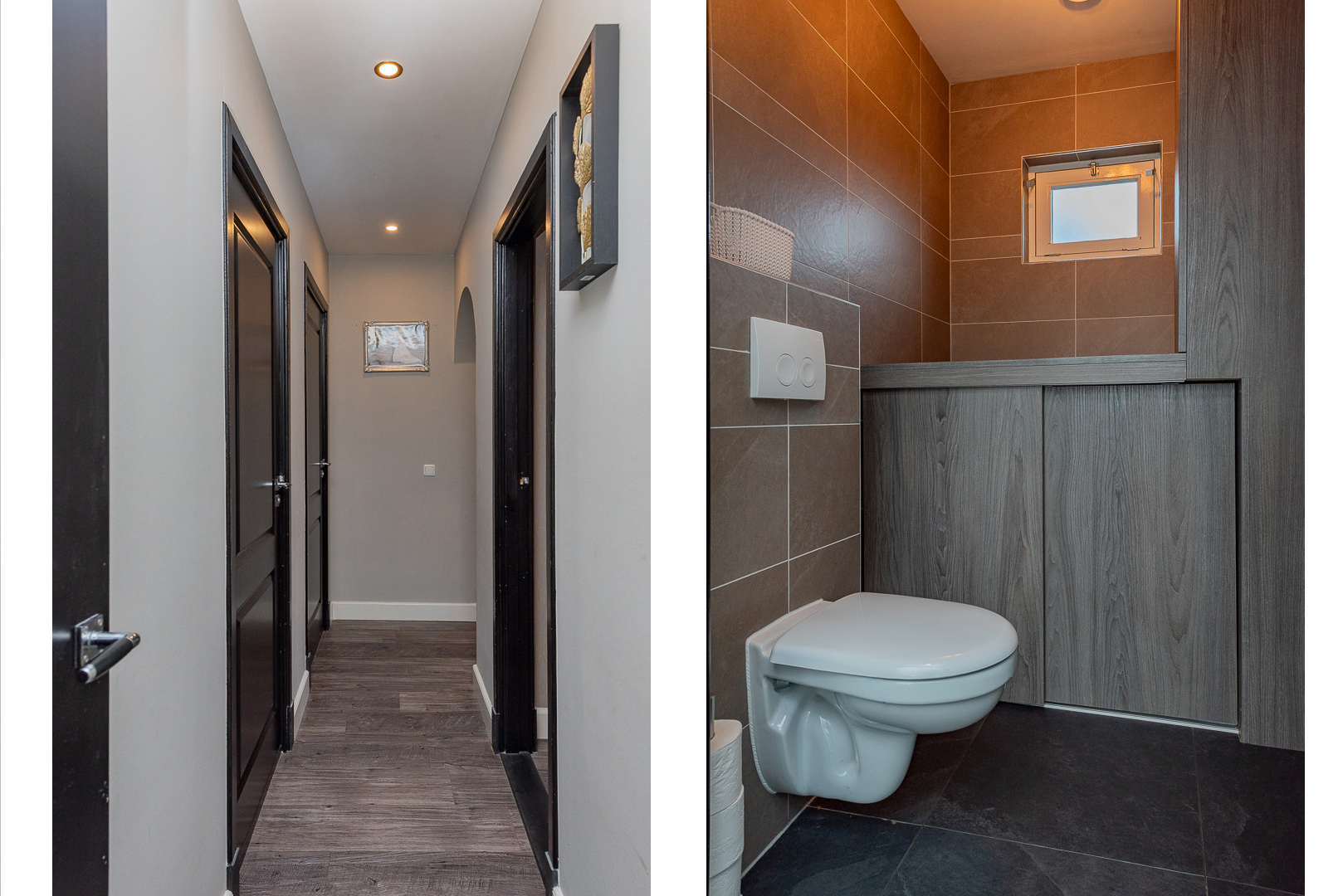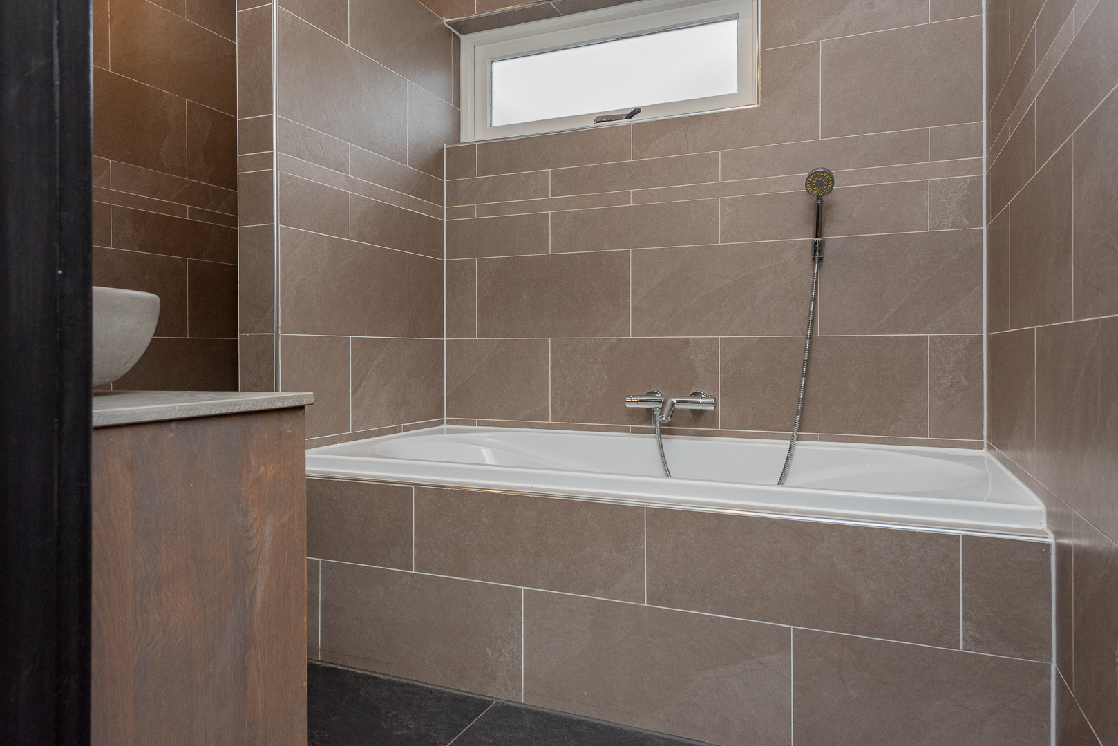 Vanuit de hal bereikbare toiletruimte, tevens bergmeubel met aansluitingen en opstelling voor de wasmachine en de wasdroger, kast met opstelling HR CV-combiketel (Intergas) en verdeler van de vloerverwarming, luxe badkamer voorzien van inloopdouche, wastafelmeubel en ligbad, leuke kinderslaapkamer en een ruime ouderslaapkamer op de begane grond met een grote inbouw (hang/leg) vaste kastenwand.