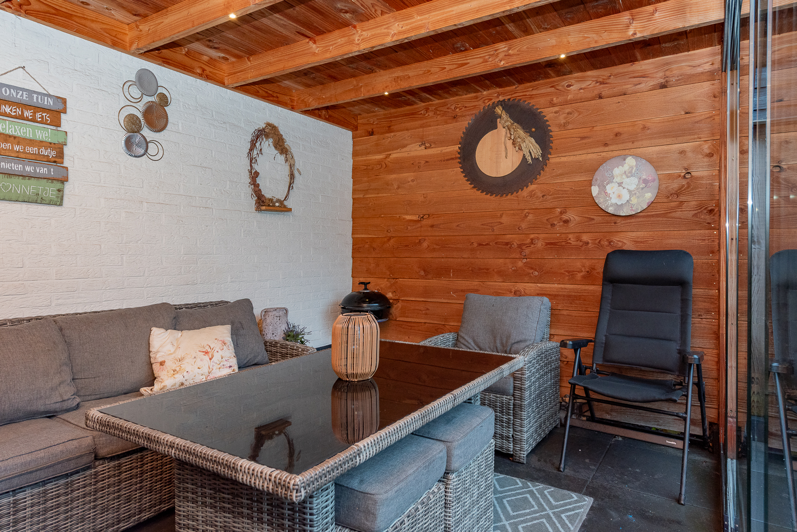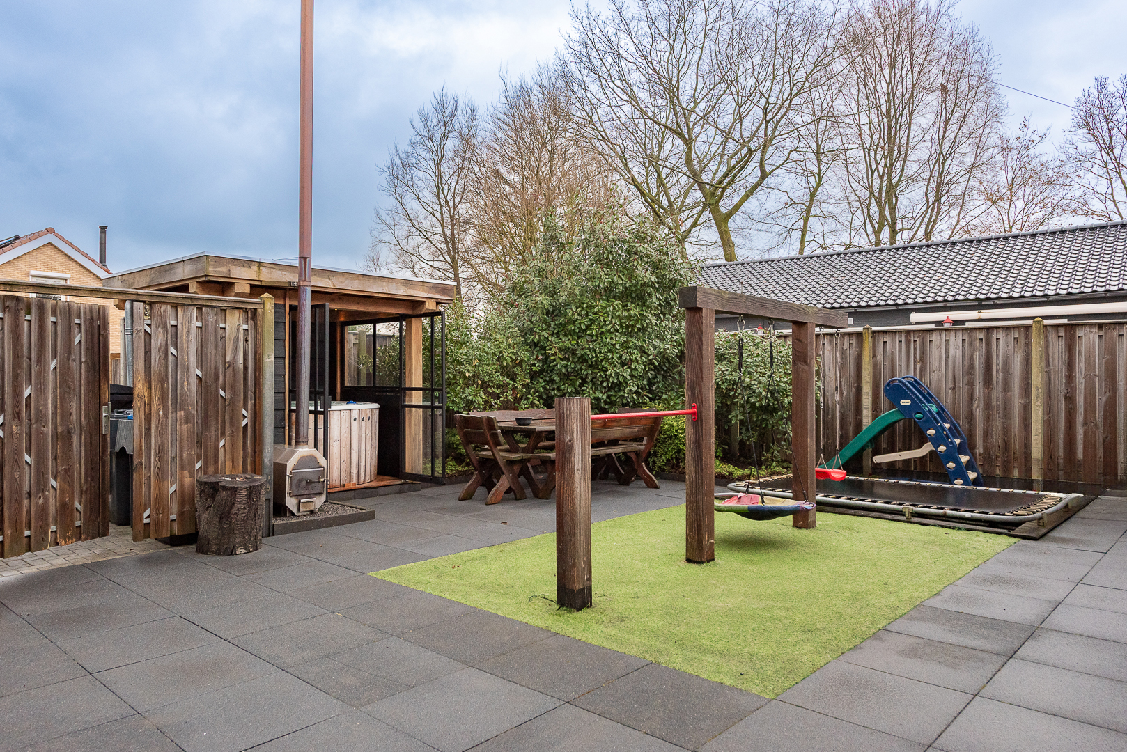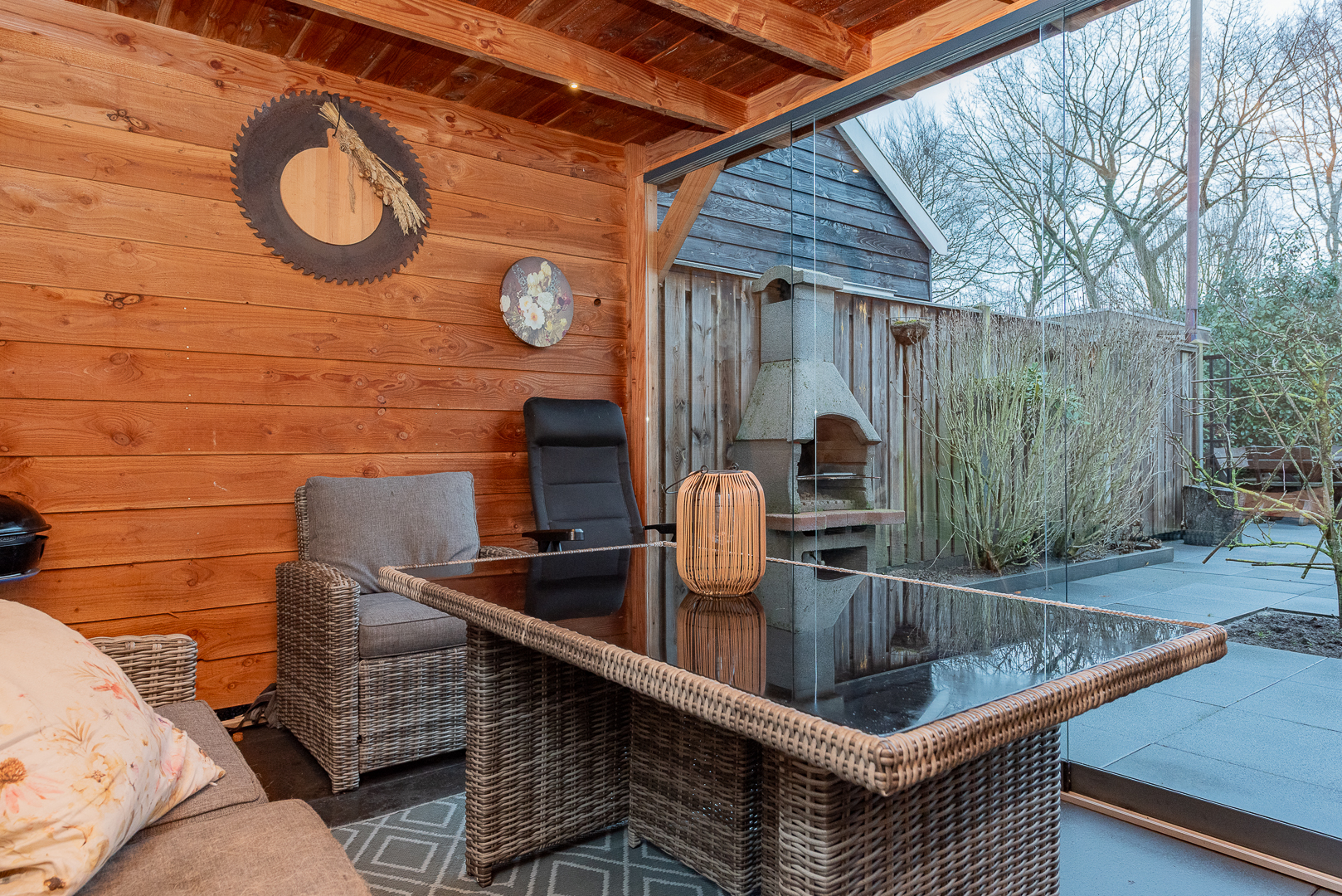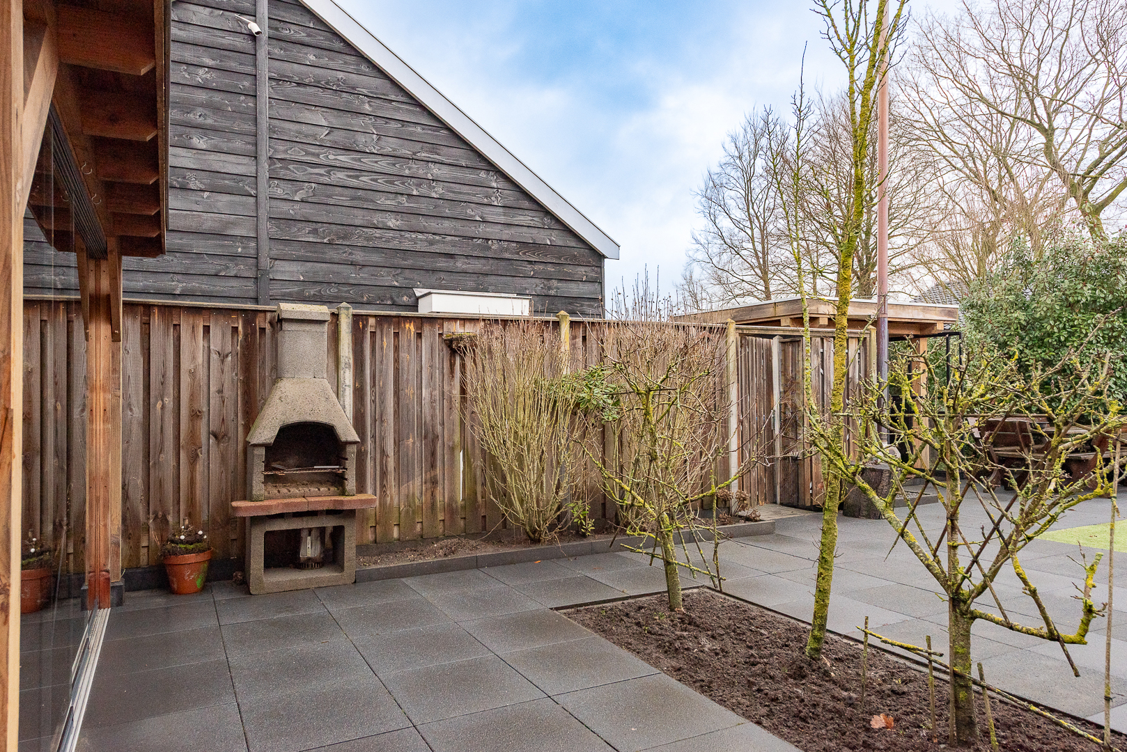 In de achtertuin van de woning is een handige berging gerealiseerd voor fietsen en tuinspullen. Ook is er een overdekt terras / veranda (bouwjaar 2016) en een overkapping voor de hottub gemaakt. De tuin is onderhoudsarm aangelegd en zowel voor de woning als ook achter de woning is voldoende ruimte om meerdere auto's te parkeren.